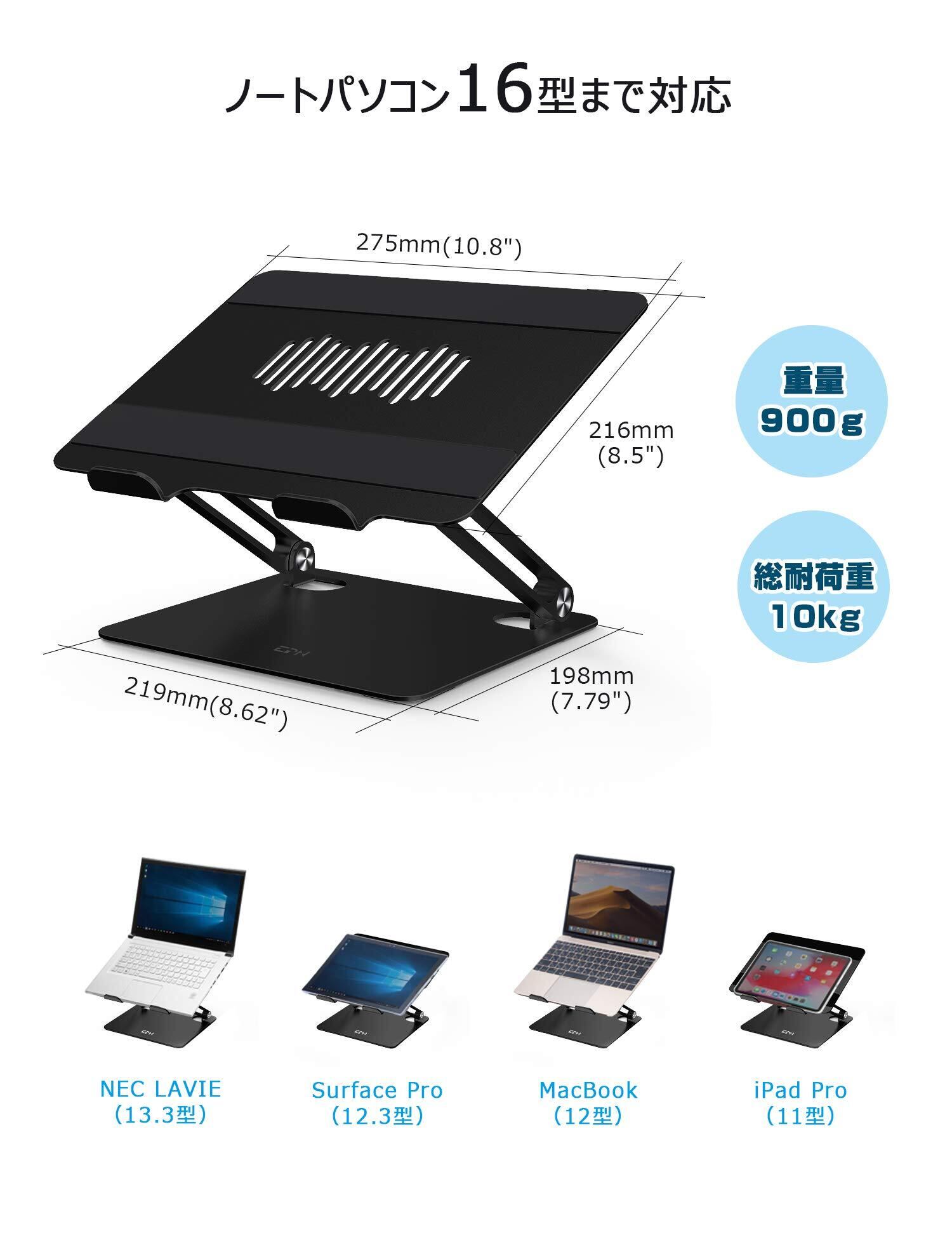 ●【製品仕様】天板サイズ:約(幅)275×(奥行き)216mm 底面サイズ:約(幅)219×(奥行き)198mm 重さ:約900g 耐荷重:最大10kg 素材:アルミニウム合金、シリコンゴム ●【対応機種】:MacBook / Acer / Lenovo / Sony / 東芝など最大16インチのノートパソコンが適用し、iPad / Surface Pro / 液タプなどのタブレットにも対応します。さらにはDJ用機材、キーボードなどのスタンドとしても幅広くご活用いただけます。