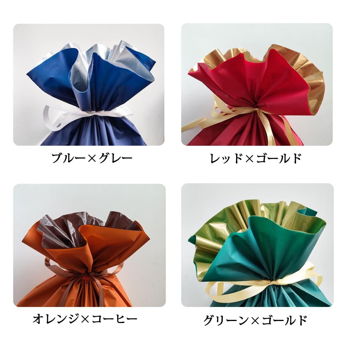 【バイカラー】 ラッピング袋はバイカラーデザインを使用して、内側と外側で色が違います。外側はサラッとした手触りになっており、耐久性・耐水性に優れています。