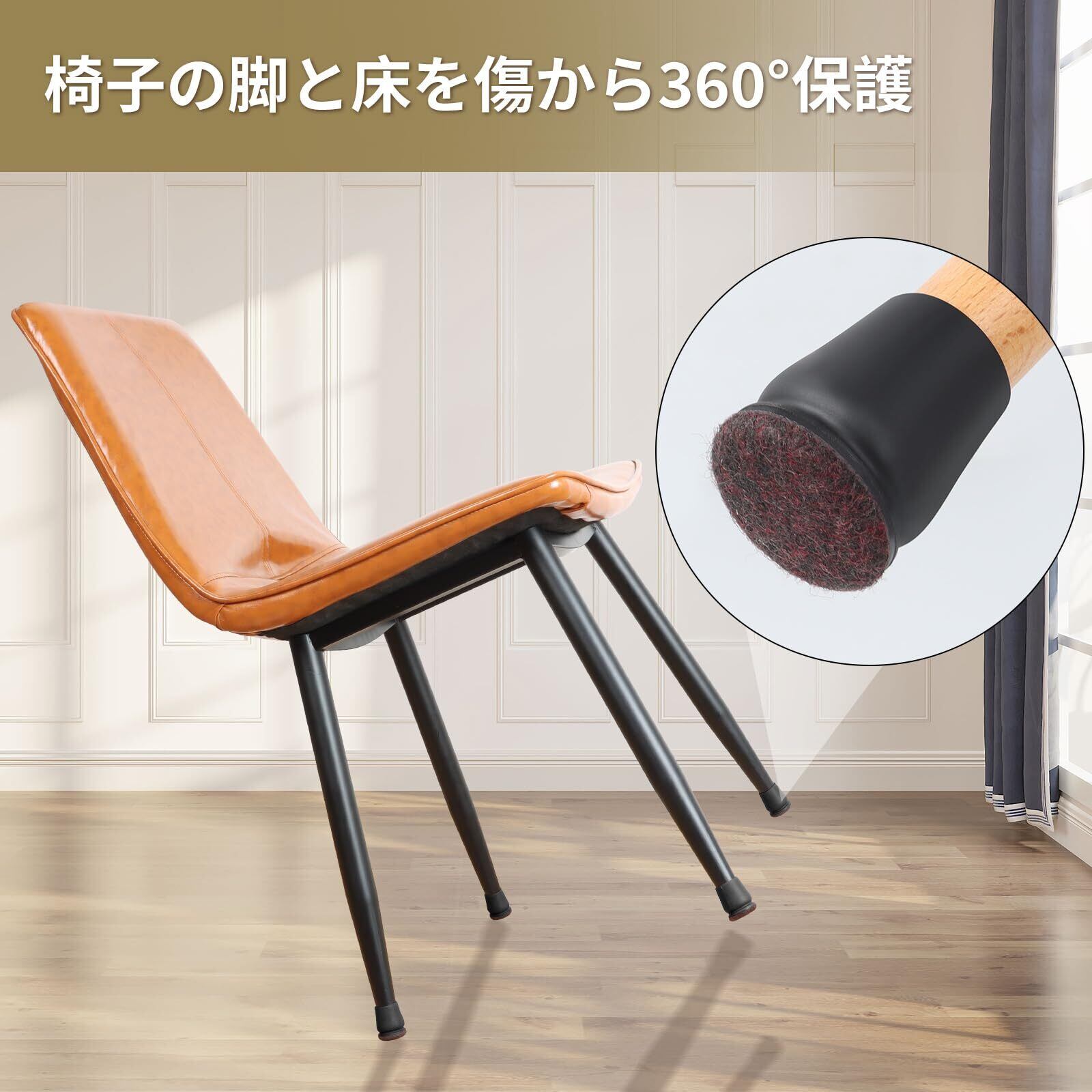 【床保護&騒音防止】椅子脚カバーの底部には厚いフェルトパッドが使用され、椅子脚の端をしっかりと包み込む。椅子脚と床が直角でなくても、傾斜した椅子の脚にも装着できます。底部のフェルトは、椅子脚の摩耗を効果的に減らし、椅子を移動させる際の床との摩擦音を低減し、自分や家族、周囲の人々に静かな環境を提供します。また、床が摩擦されることで傷つくのを防ぐのにも役立ちます。