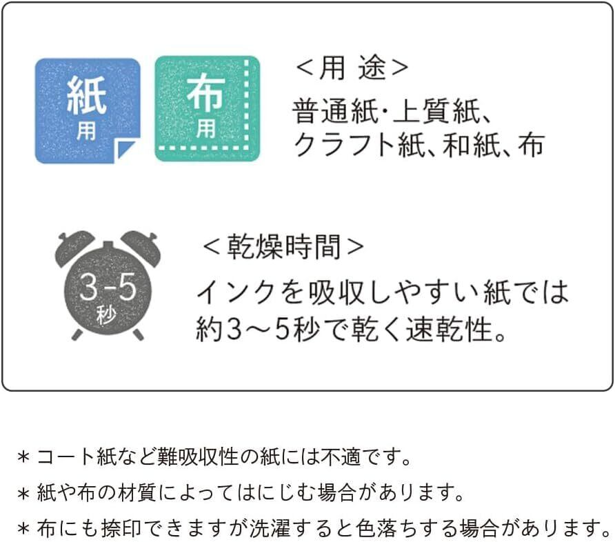 ご注意:コート紙などの難吸収性の紙には不適です。/紙や布の材質によってはにじむ場合があります。/布にも捺印できますが洗濯すると色落ちする場合があります。