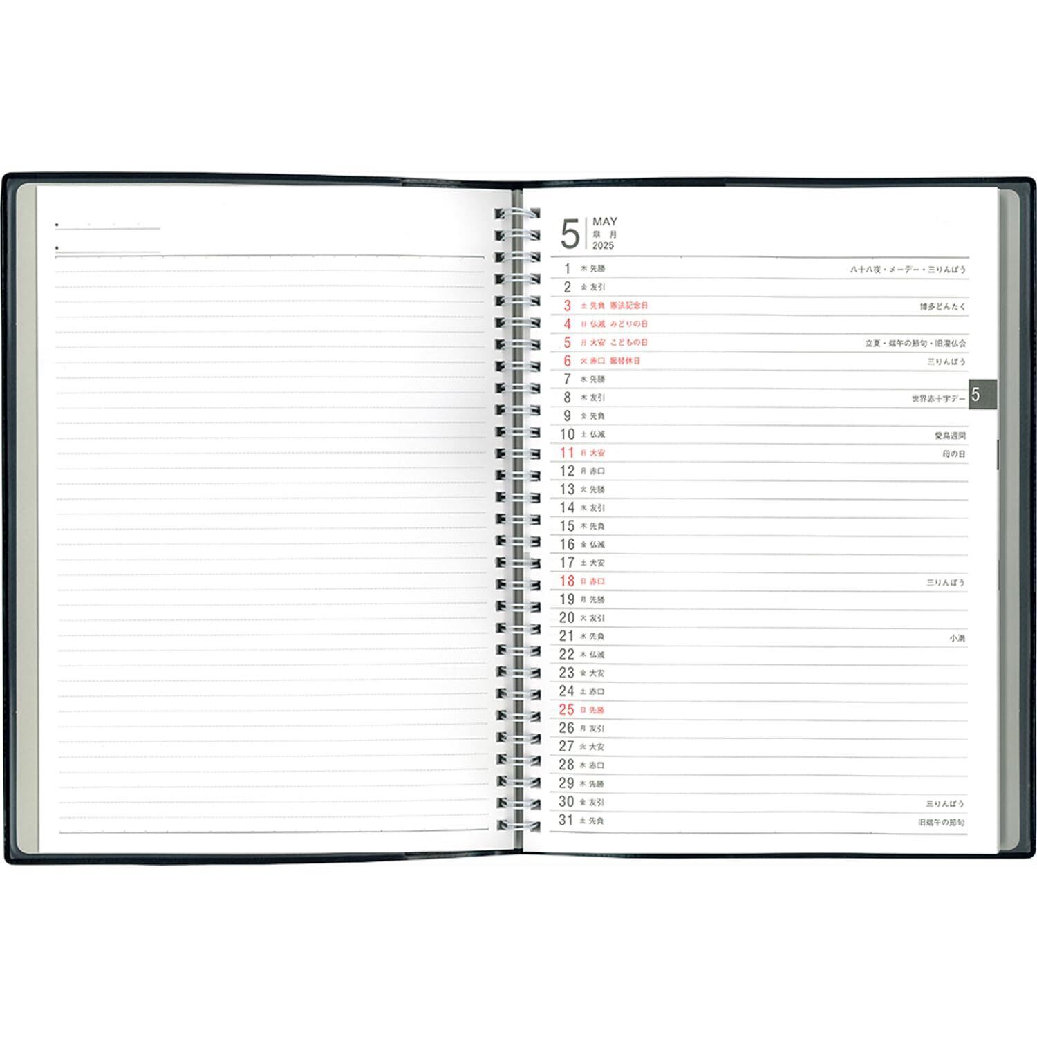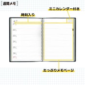 カレンダーの種類 ビジネスダイアリー,月曜始まり,見開き1週間記入,時刻入り,2色刷,多色刷全国鉄道路線図,リングとじ,168ページ