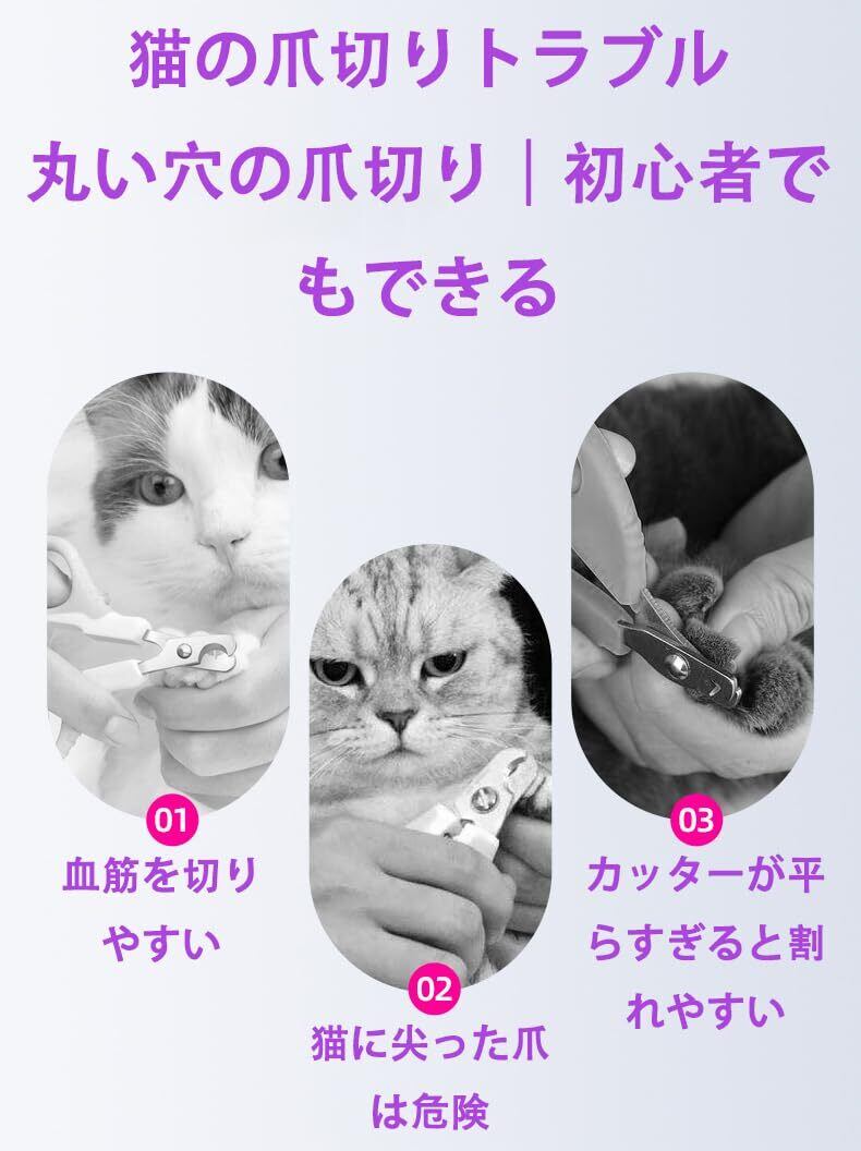 【安全な丸穴タイプ】猫の爪の形状に合わせた安全な丸穴設計で、安定して爪を切ることができ、猫の爪が切れるのを防ぎます。初心者の方でも安心です。