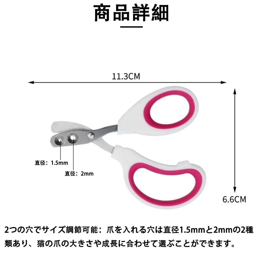 【小型~大型ペット用】小型~大型ペット用2穴設計、子猫から大型猫まで使えるペット用爪切り。猫の爪を切る際に安定感を与えるため、丸穴タイプの安全なデザインを採用しています。初心者の方でも安心してご使用いただけます。また、人間工学に基づいたデザインで、握りやすく疲れにくい設計となっています。高品質のステンレス鋼の刃を使用しており、丈夫で耐腐食性に優れているため、長期間ご使用いただけます。成猫、子猫、ウサギ、ティンカーベル、モルモット、小型犬などの小動物、ペットに適しています。軽量で持ちやすく、長時間使用しても指が痛くなりにくい設計となっており、滑り止め効果もあります。バキバキと音がせず、素早く爪を切ることができ、ペットにストレスを与えずに爪のお手入れができます。猫、犬、ウサギ、ハムスター、鳥などの小型ペット用に最適です。ペットの爪が長くなったら、体に接触して怪我をしないよう、この爪切りをご利用ください。