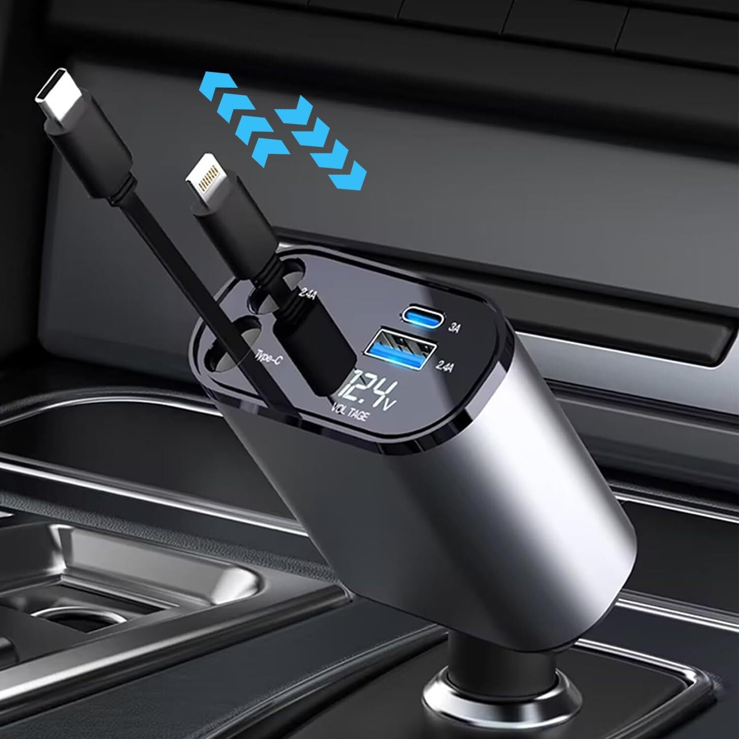 【巻き取り式】4in1 車 充電器 シガーソケット 4台同時充電 カーチャージャー 巻き取り式充電ケーブル 2本 Type-C100W/Lightning 20W急速充電 車載充電器 対応iPhone 16/15/14/13/12, Galaxy S22/S21 UItra, Xperia, iPad, AQUOSなど 電圧計を搭載 DC12/24V車対応