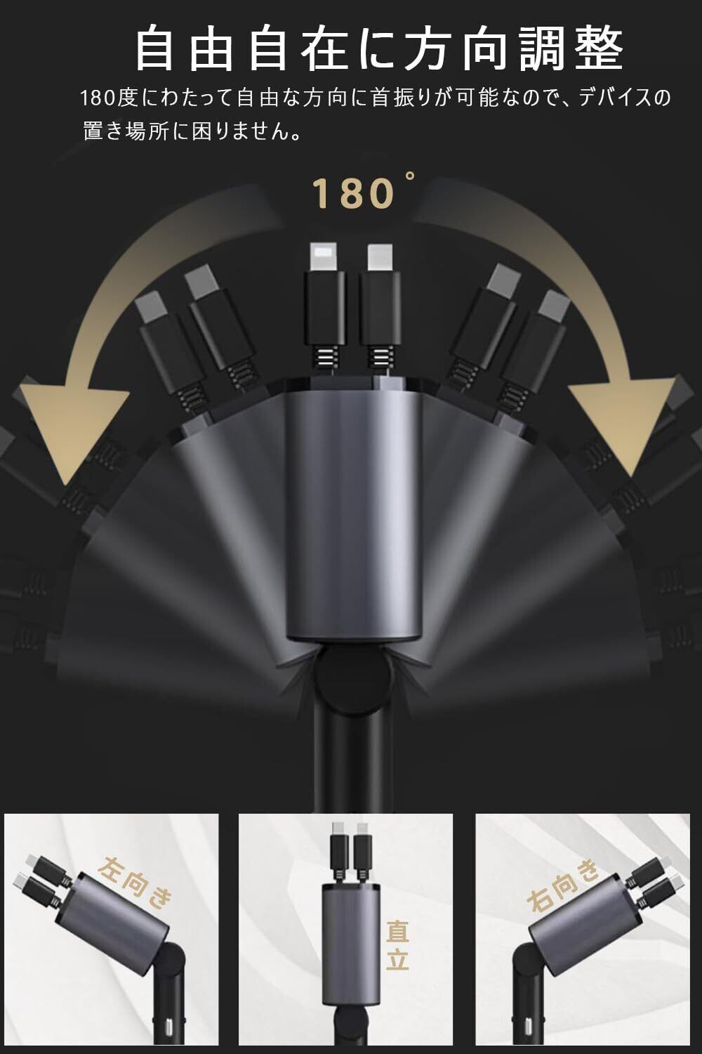 自由自在に方向調整:180度にわたって自由に首振りができる設計により、デバイスの置き場所に困ることがありません。どんな角度でもお好みに合わせて調整できるため、最適な位置での充電や使用が可能です。車内のスペースに合わせて、便利な位置にセットできるので、ドライブ中も快適にデバイスを利用できます。