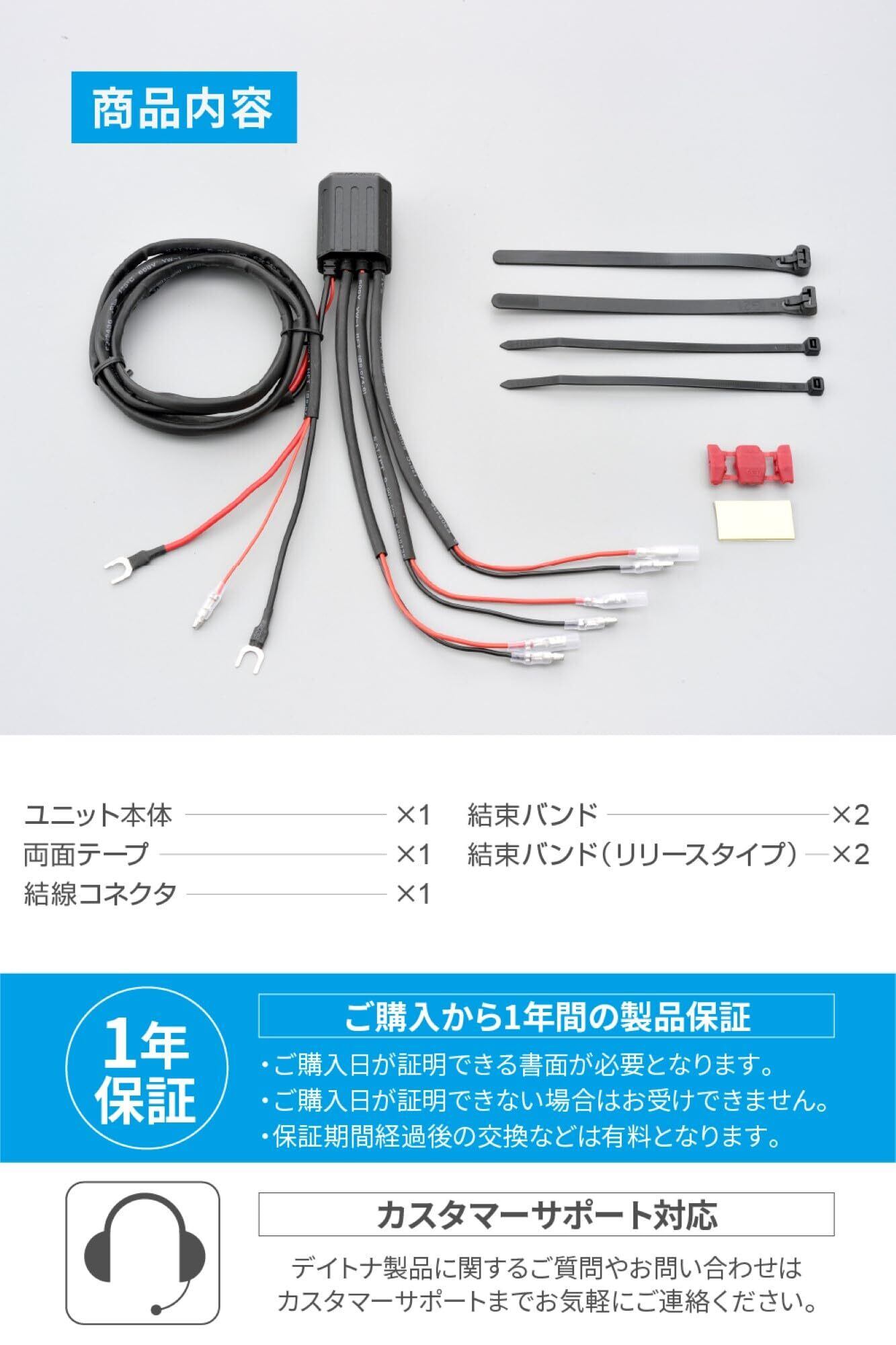 商品構成:ユニット本体×1、両面テープ×1、結線コネクタ×1、結束バンド×2、結束バンド(リリースタイプ)×2