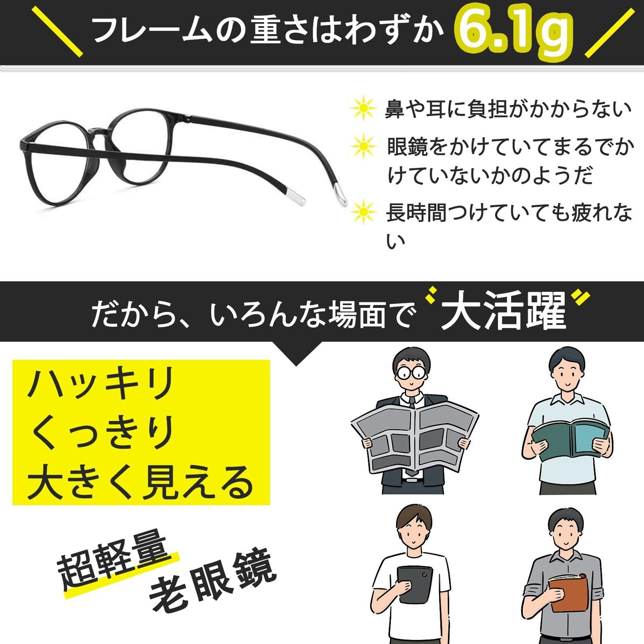 超軽量老眼鏡 - フレームはTR90製で、重さはわずか6.1g、非常に軽く、鼻や耳に負担をかけません。 テンプルは折れずに自在に曲げられるほど柔らかく、耐久性に優れています。