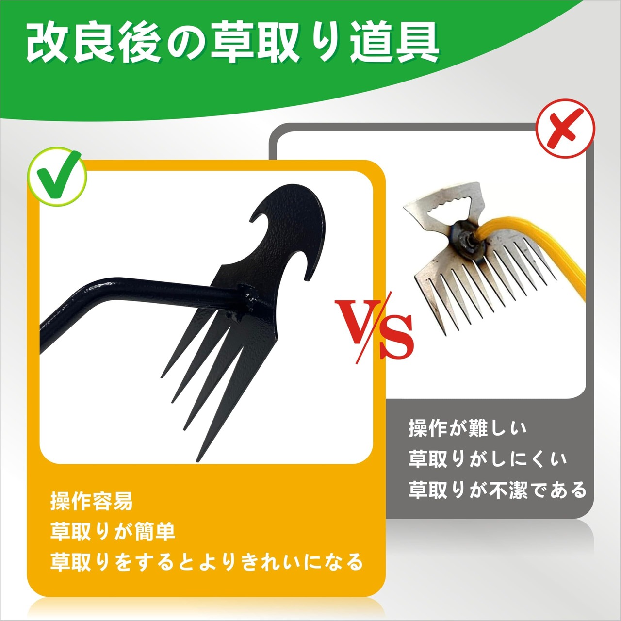 【両用除草ツール】4本歯と先の鋭利な刃との2in1で、深めの雑草や根を切ったりしつつ、引っこ抜く作業もとてもしやすく、使いやすいです。 4本の鋭い歯を草の根元にできるだけ近い土に差し込んで引っ張るだけです。また、刃先を地面に差し込み、そのまま持ち上ける事で草が抜けます。葉が放射線状に広がっている雑草を抜く際に効率的です。