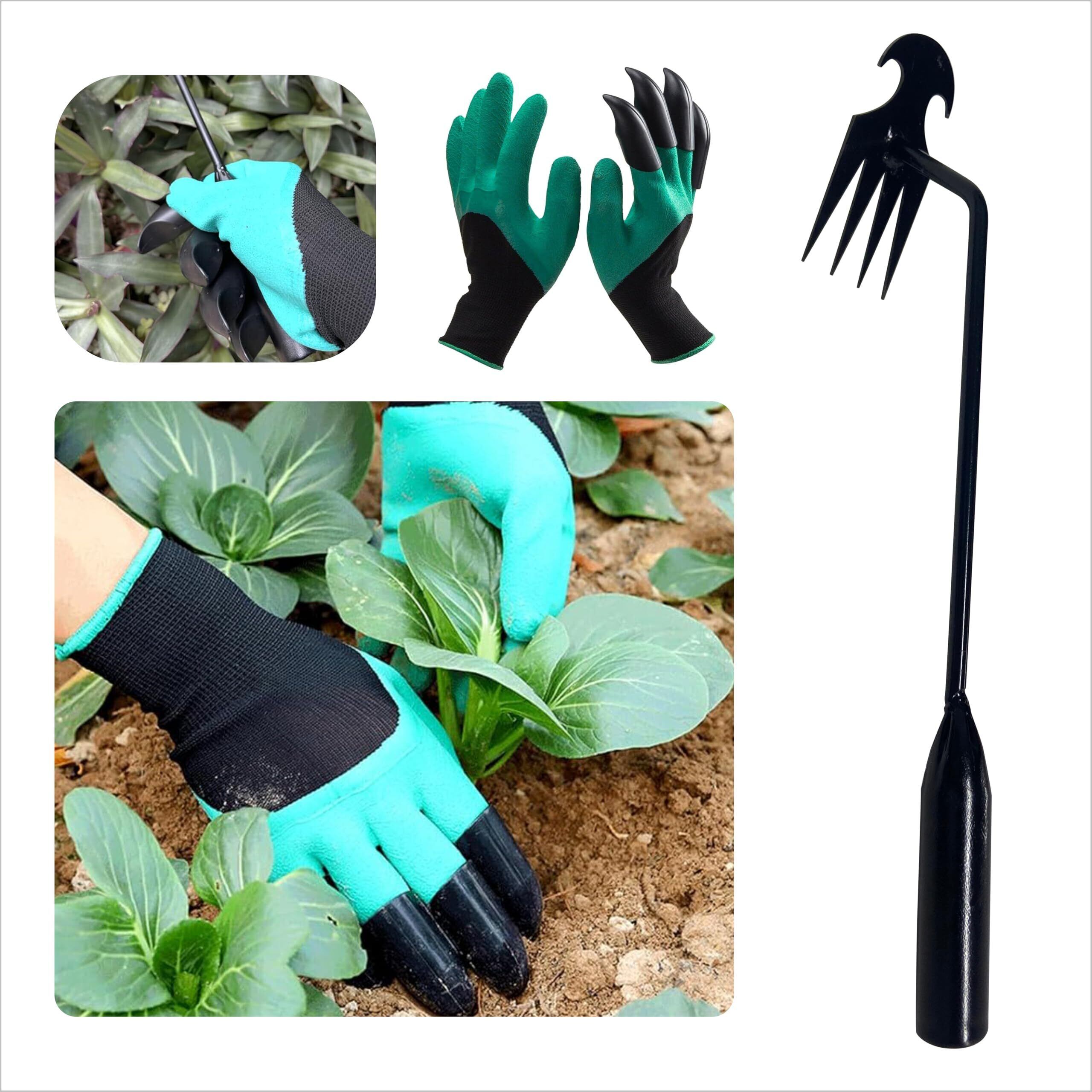 Rachil 草取り道具 雑草ブラシ 雑草抜き 雑草取り道具 雑草除去ツール 園芸用品 掘り起こし道具 草刈りかま 草取り器 4歯 超軽量 (草取り道具2本+園芸用手袋1組)
