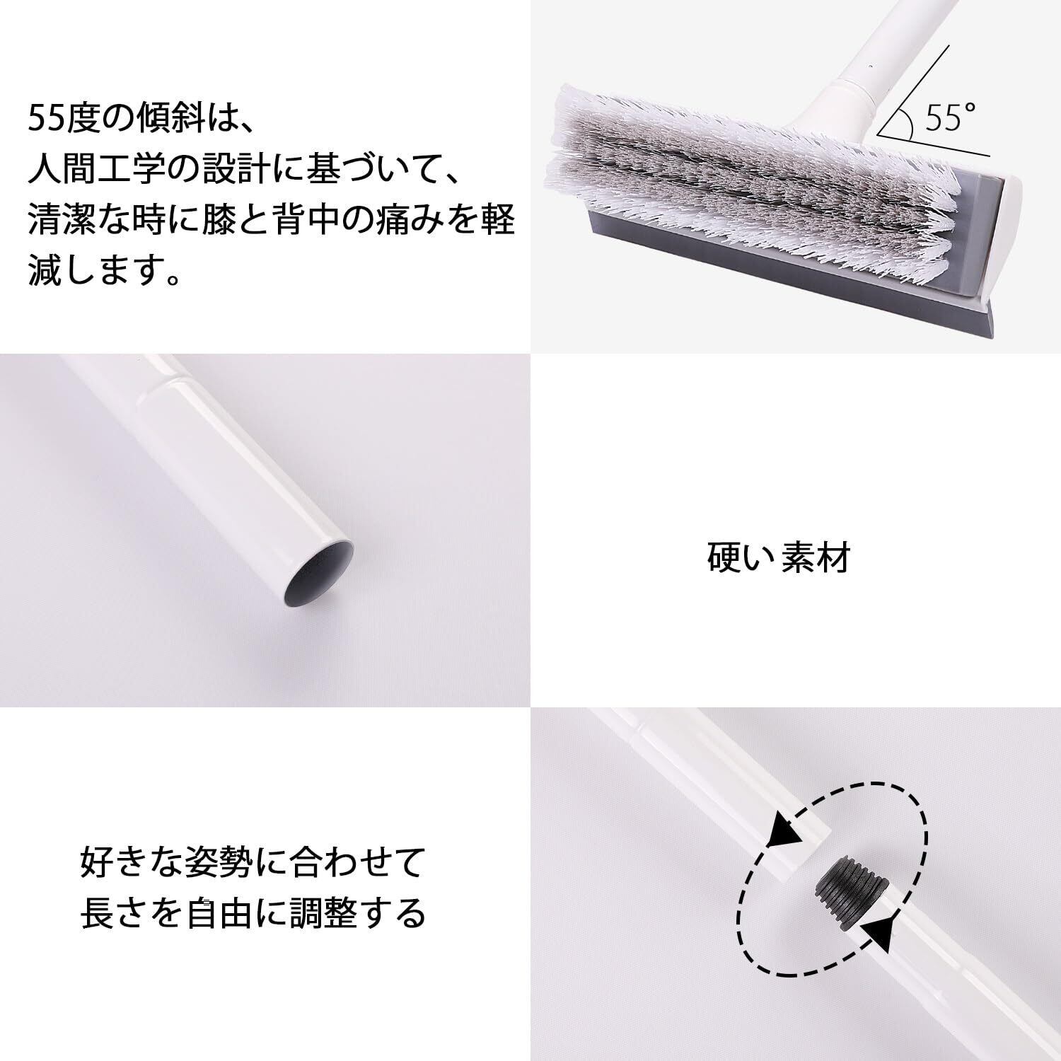 【清掃能力は強い】ブラシは乾いても濡れても使用できます。壁、キッチン、バスルームに使用されるだけでなく、ガレージ、歩道、スタジアムなどにも最適です。 【水に強いPP素材の硬いブラシ】毛先を広げた形状だからコーナー部分もしっかり洗えます。異なる太さの毛のダブル植毛なので、浴室の床の細かい溝にも入り込み、汚れを掻き出します。
