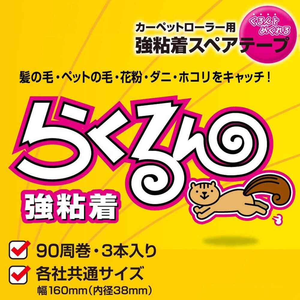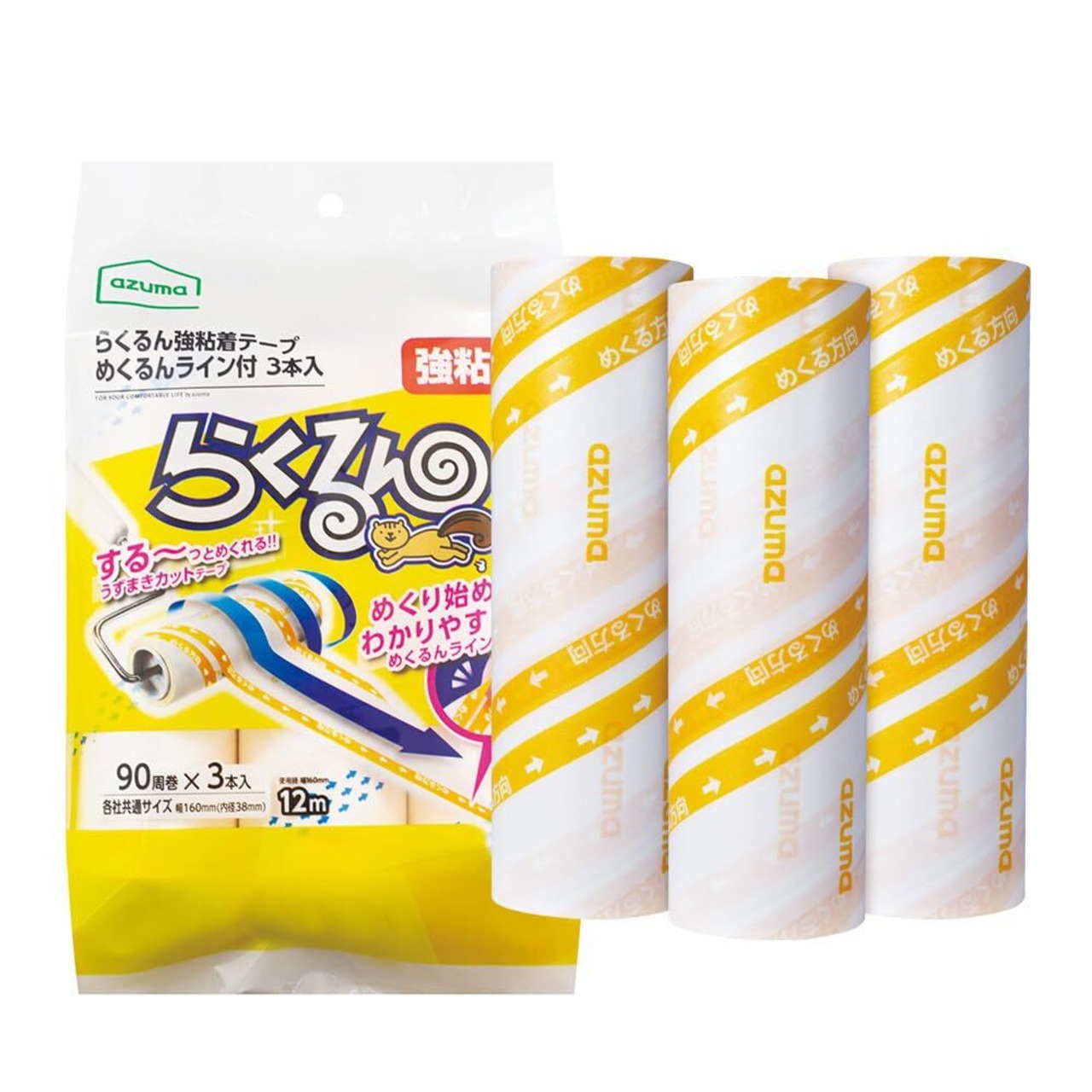 【新着商品】アズマ工業 らくるん強粘着テープめくるんライン付3本入 90周巻 スペアテープ めくり位置をみつけやすい黄色いライン カーペットローラー 各社共通サイズ 幅16cm
