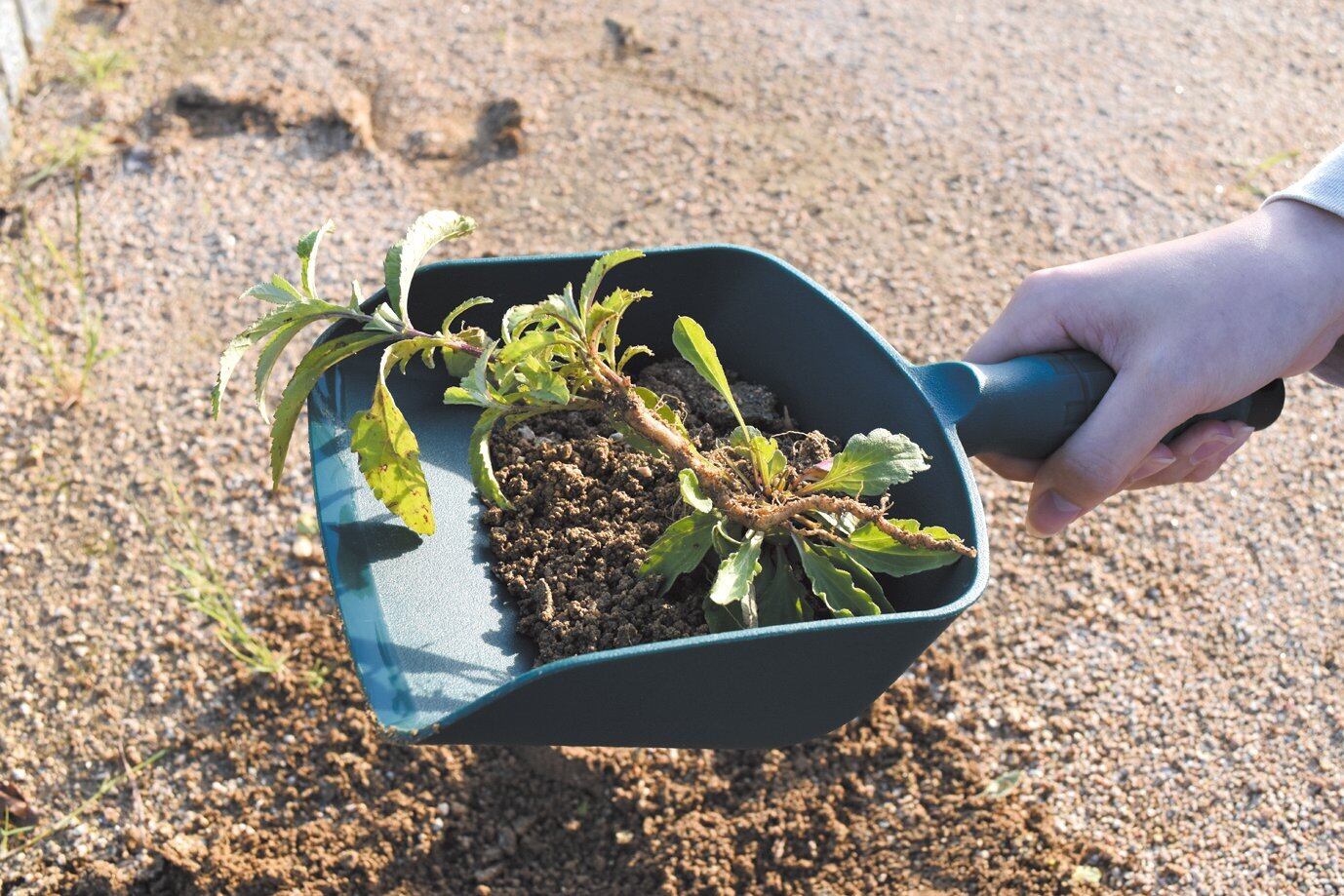 特徴:土をすくって片手で揺らすだけで、その場で簡単にフルイにかけることができる