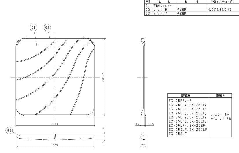 ●標準換気扇交換用フィルター<br>●梱包内容:フィルター5枚入、オイルトレイ5個入<br>●フィルター寸法(mm):336.5X344<br>●本体形名:EX-25LF8(7)(6)(5)(4)(2)、EX-25EF8(7)(6)(5)(4)(2)、EX-25EF2-R
