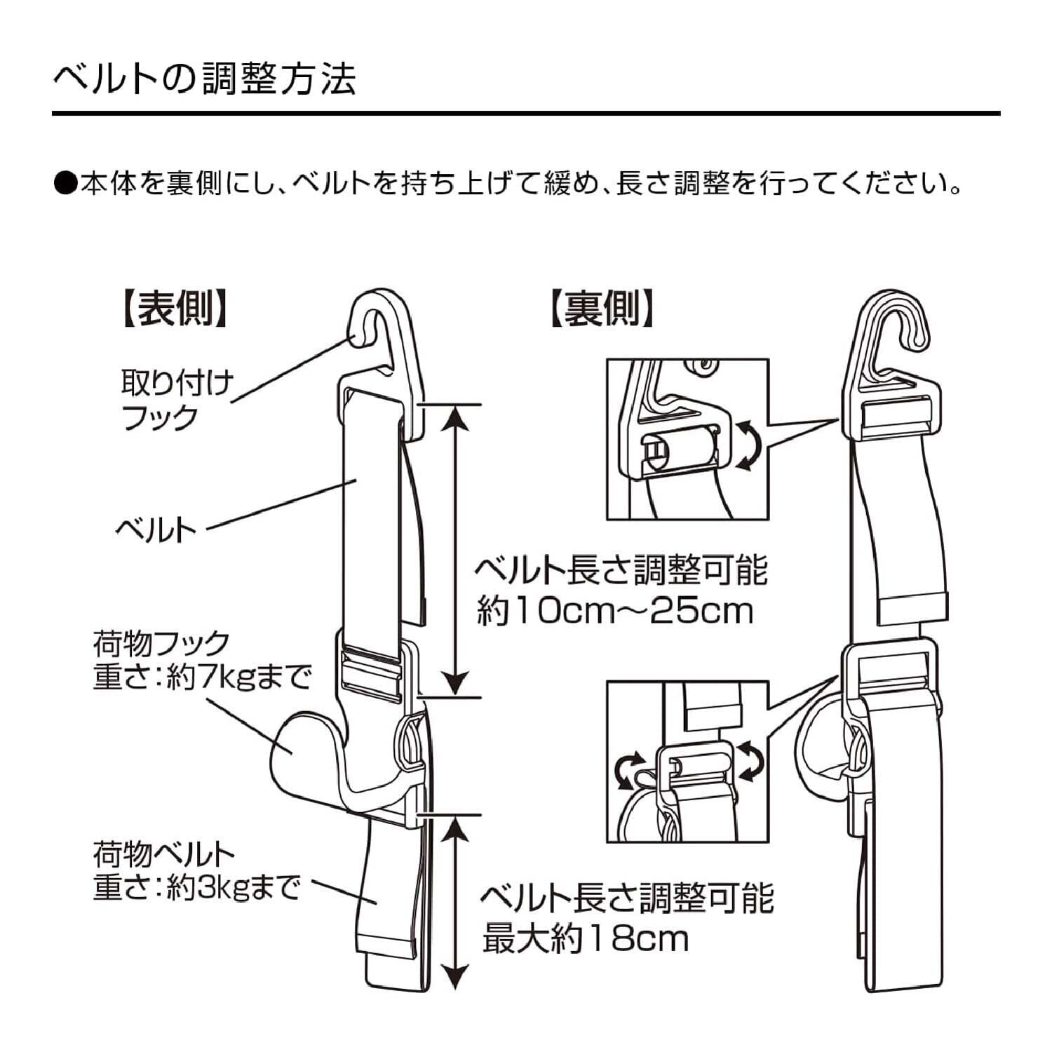 ●耐荷重(約10kg)以内でも常時荷物を吊り下げた状態にしないでください。特に炎天下の車内での長時間放置はお避けください。