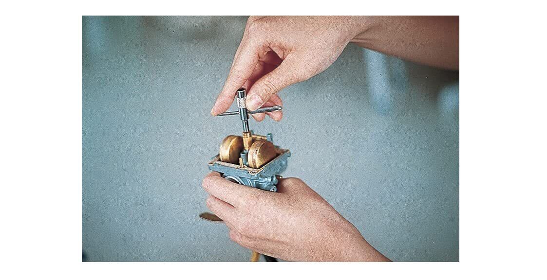 ミクニ,ケーヒン製キャブレターの達人工具。プラスドライバー(フロートチャンバー等の脱着時)、マイナスドライバー(大)(丸型メインジェット脱着時)、マイナスドライバー(小)(スロージェットとエアースクリュー脱着時)