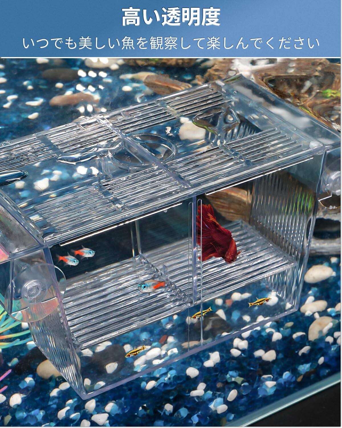多目的な使用:2つの取り外し可能なセパレーターが3つの部屋を構成しています。一番下は稚魚の孵化場、もう2部屋は攻撃的な魚や病気の魚を隔離するために使用できます。