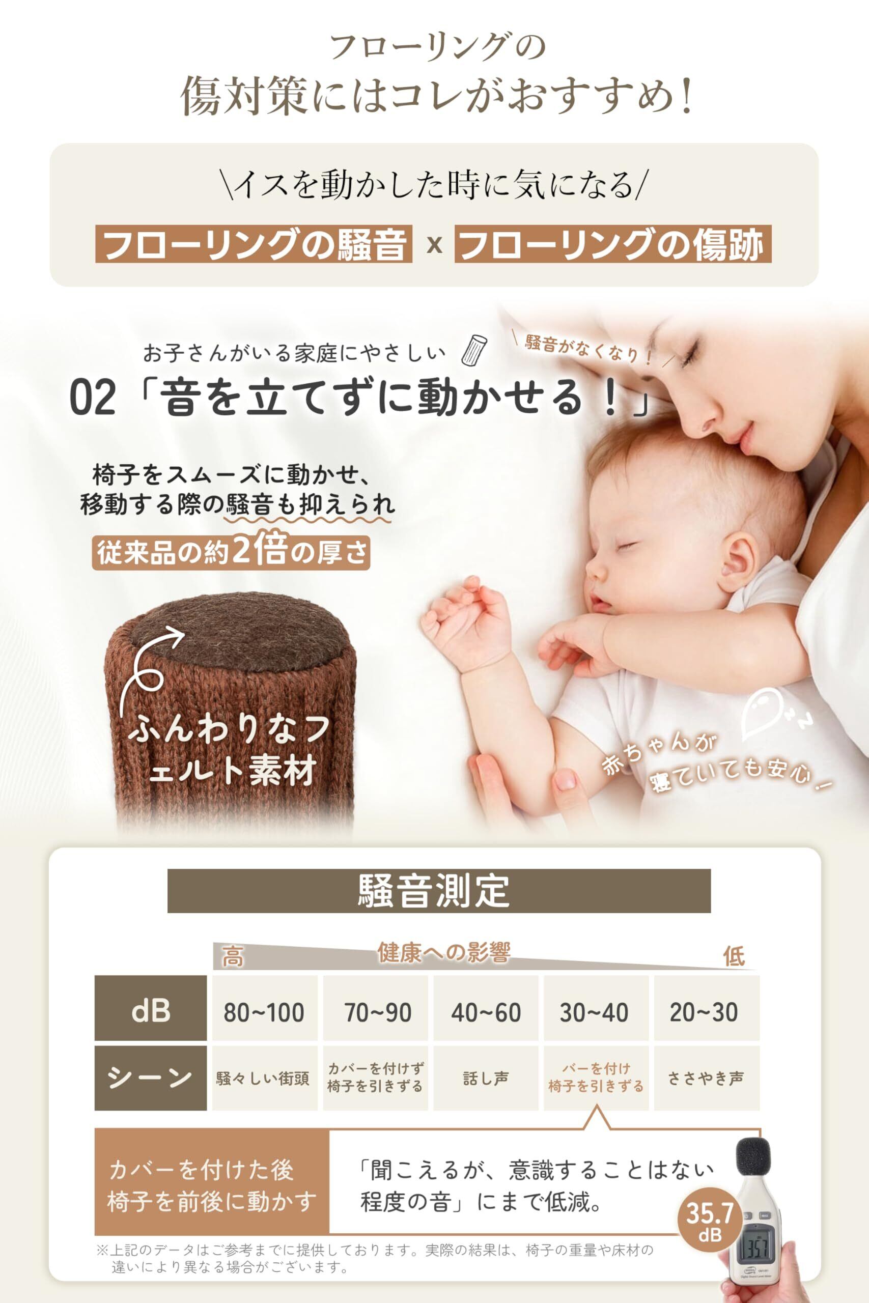 【二重構造&厚底フェルト・高耐久性】 ボディ部分には二重ニットを採用し、底部には厚いフェルトを使用しています。これにより、椅子脚カバーは磨耗に強く、防音効果も抜群です。椅子脚を保護しながら、床の傷も防止します。また、滑りやすい素材により、椅子をスムーズに動かせ、動かす際の騒音も抑えられます