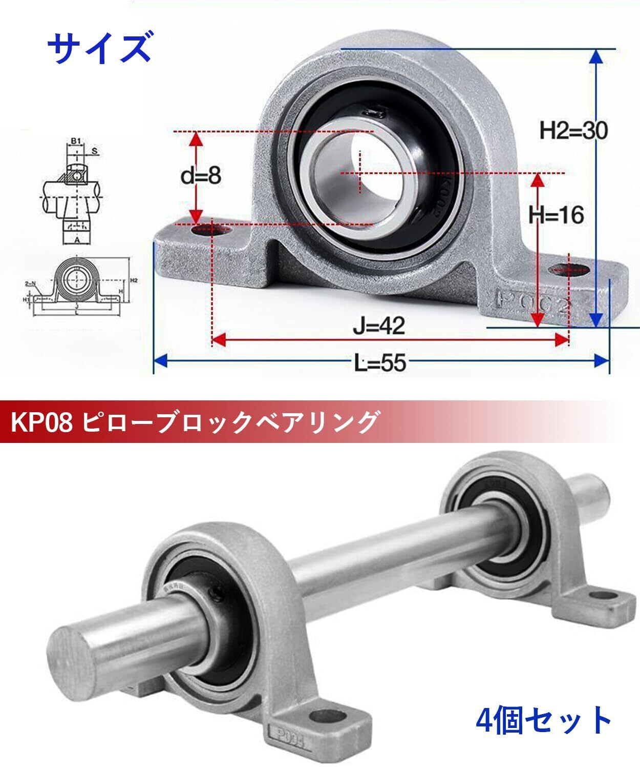 モデル:KP08 ピローブロックベアリング。穴内径:8mm、数量:4個セット。工業生産制作において、軸受け座に対する高い要求を満たし、機器の安定した動作と長時間の使用を確保します。