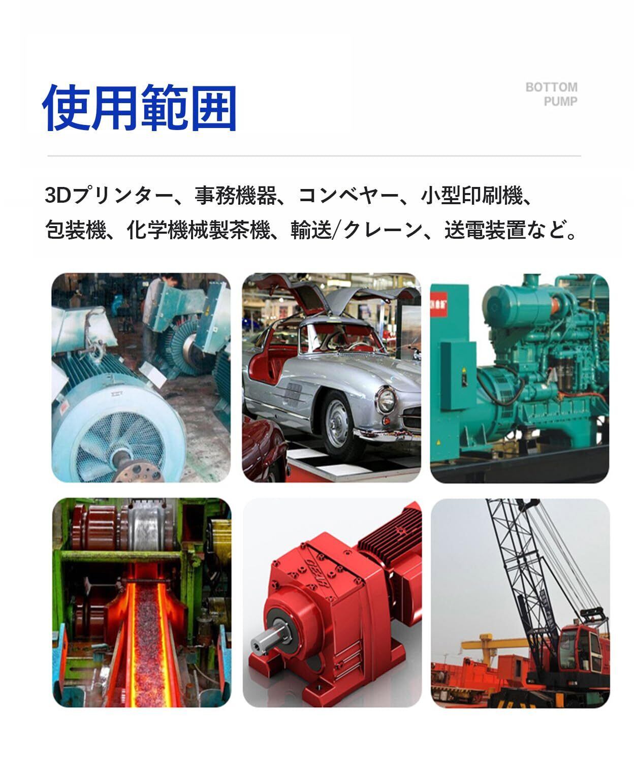 3Dプリンター、事務機器、コンベヤー、小型印刷機、包装機、化学機械製茶機、輸送/クレーン、建設機械、送電設備などに適用。取り付けが簡単で、操作が簡便であり、寿命が長く、最適な選択肢です。
