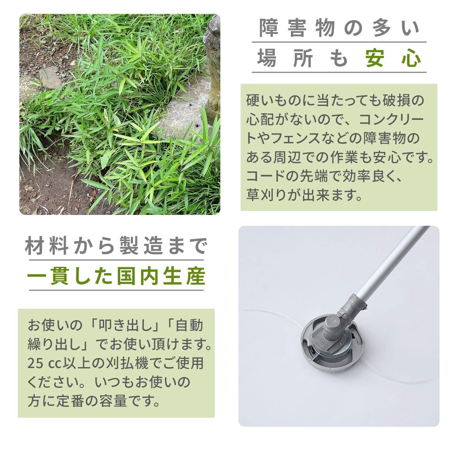 【特徴】草刈用ナイロンコードです。四方にノコギリ形状の刃を出すことで切れ味抜群!硬い草もラクラク破断します。先細りしない新形状で、最高の刈り心地が持続します。材料から製造まで一貫した国内生産でお使いの「叩き出し」「自動繰り出し」でお使い頂けます。硬いものに当たっても破損の心配がないので、コンクリートやフェンスなどの障害物のある周辺での作業も安心です。コードの先端で効率良く、草刈りが出来ます。