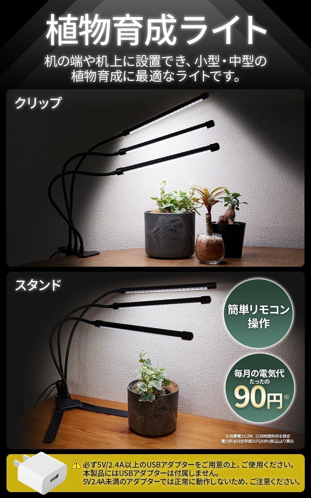 【小型・中型の植物育成に最適】机の端や机上に設置できる、小型・中型の観葉植物に最適な3灯の植物育成ライトです。