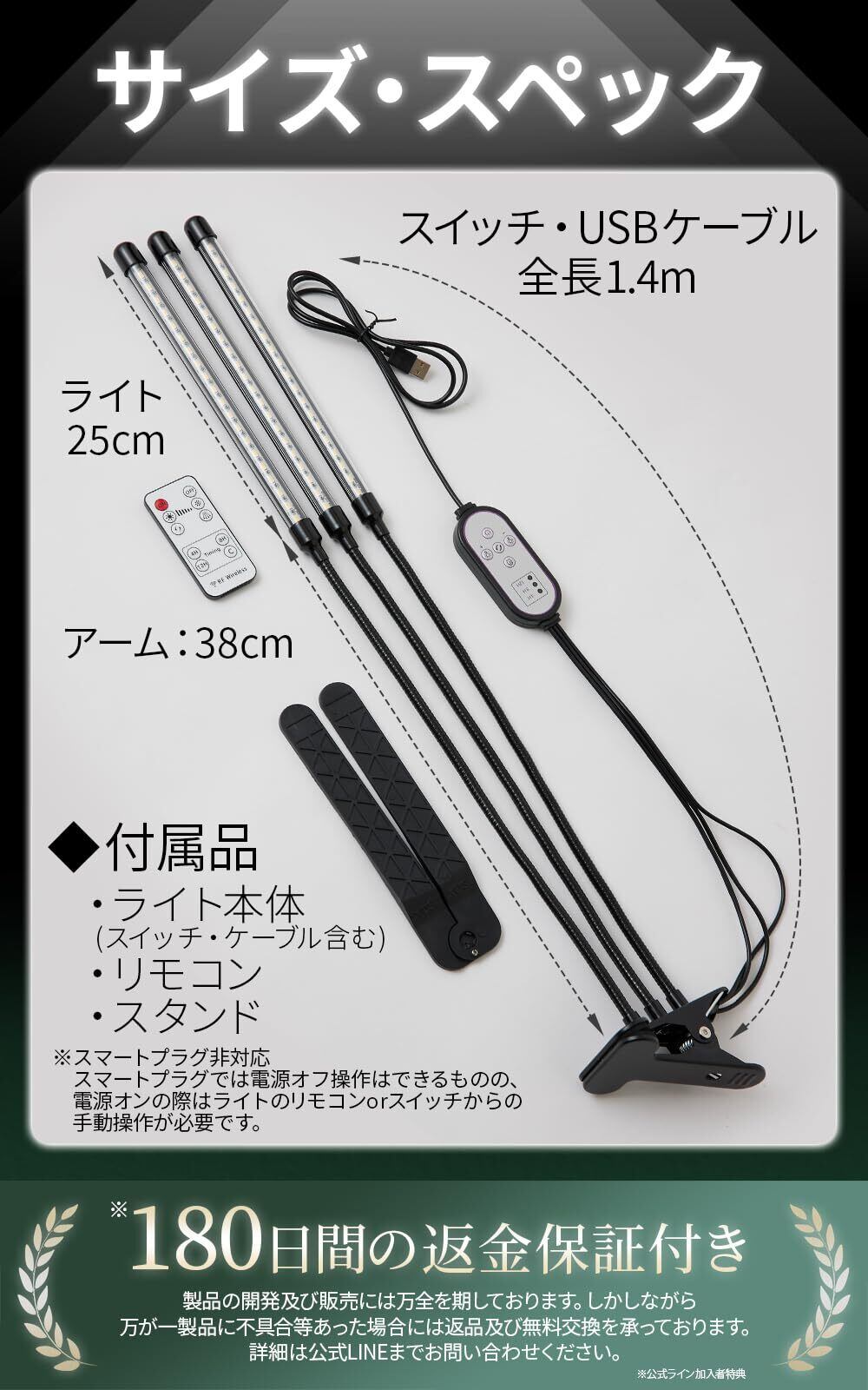 【植物育成をもっと便利に】●リモコン操作可能:12メートル以内の距離から操作可能。●記憶式タイマー:4H・8H・12Hの3モード。最初の点灯時刻に毎日自動点灯。●10段階調光:1〜10段階まで調光可能。●点灯本数切り替え:1・2・3本と点灯本数の切り替えが可能。