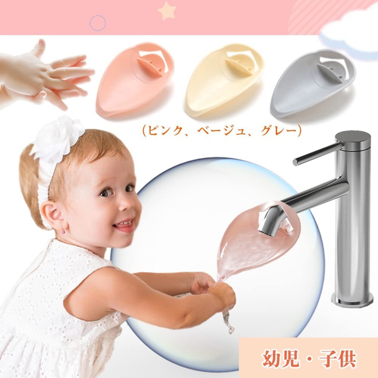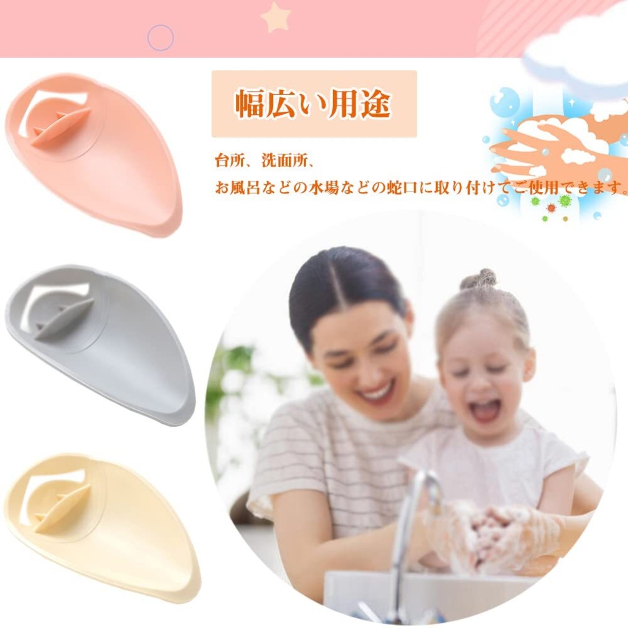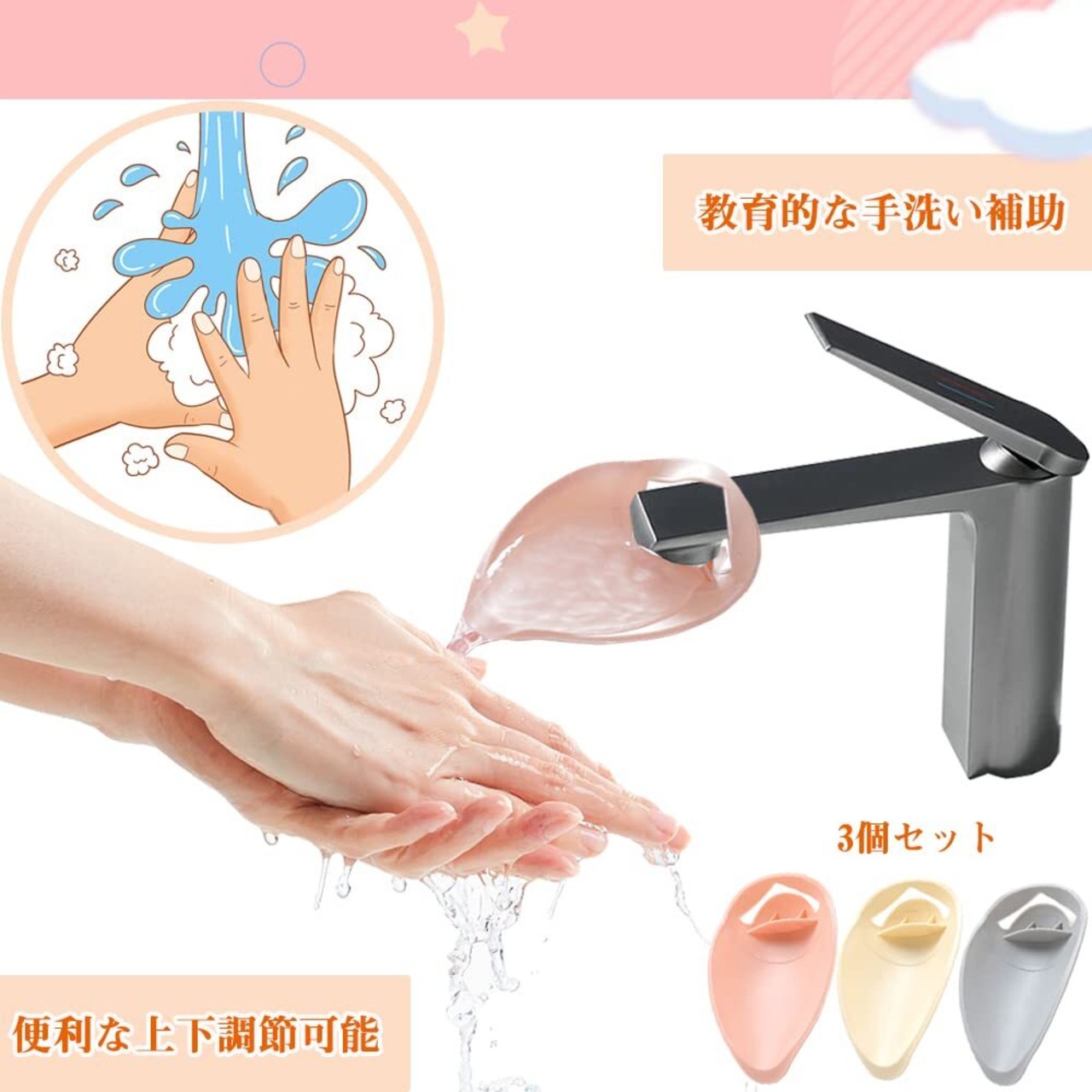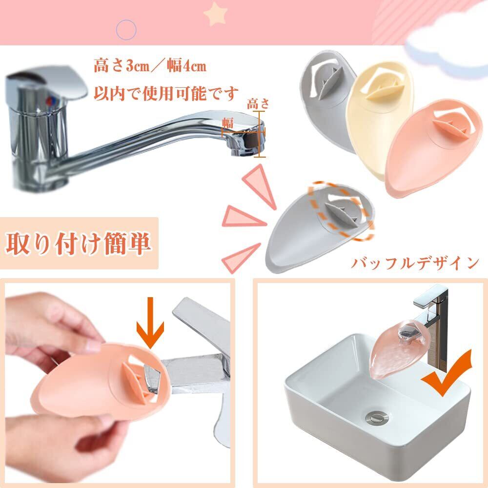 ウォーターガイド 蛇口補助 3個セット 手洗い補助 子供用 高さ 補助 延長 調節可能 取付簡単 洗面台/浴室/台所/洗い場/浴室の水道蛇口さんに適用 デザイン パーツ 3色