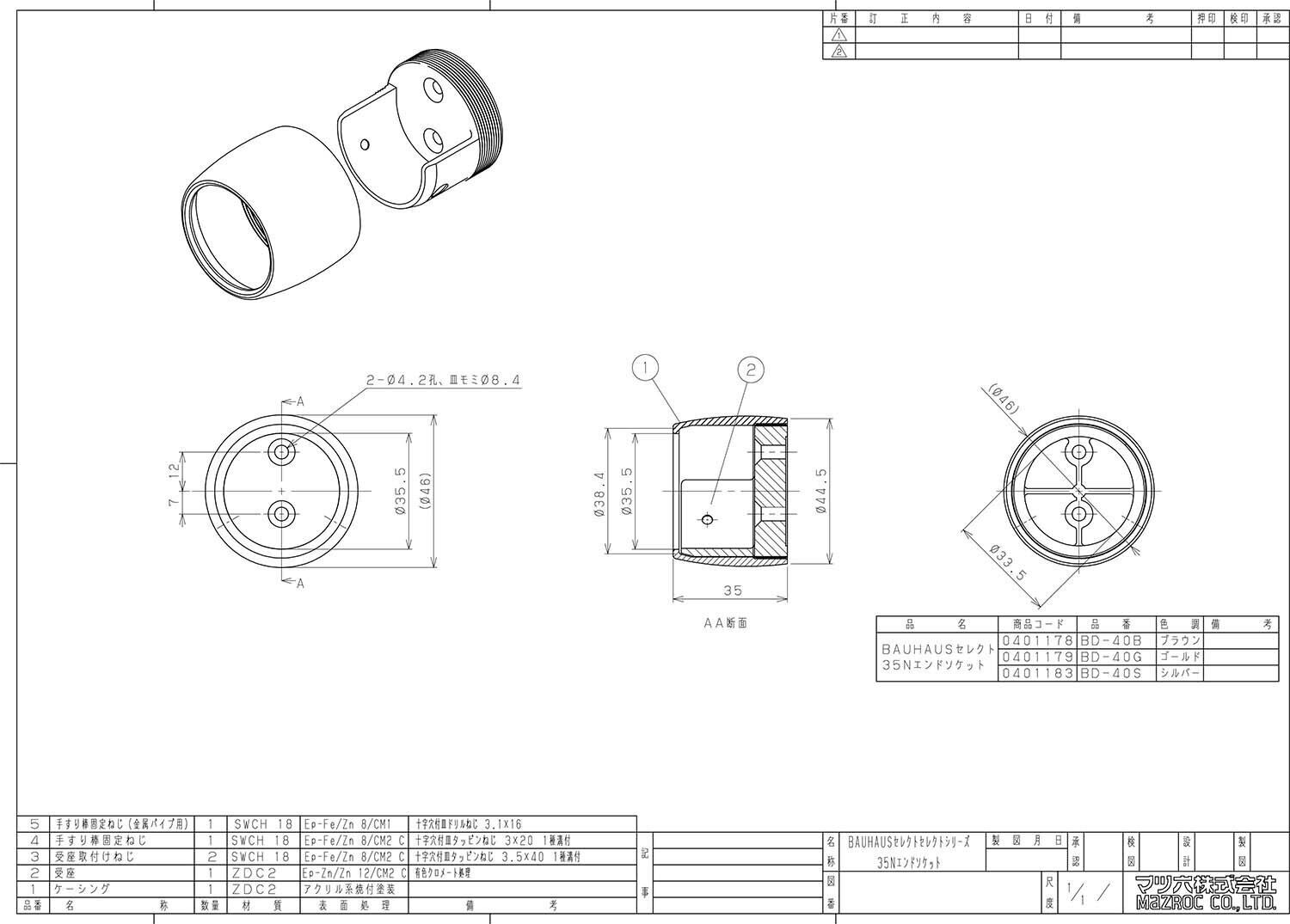 マツ六(Mazroc) 手すり部材 BAUHAUS セレクト 35Nエンドソケット BD-40G ゴールド