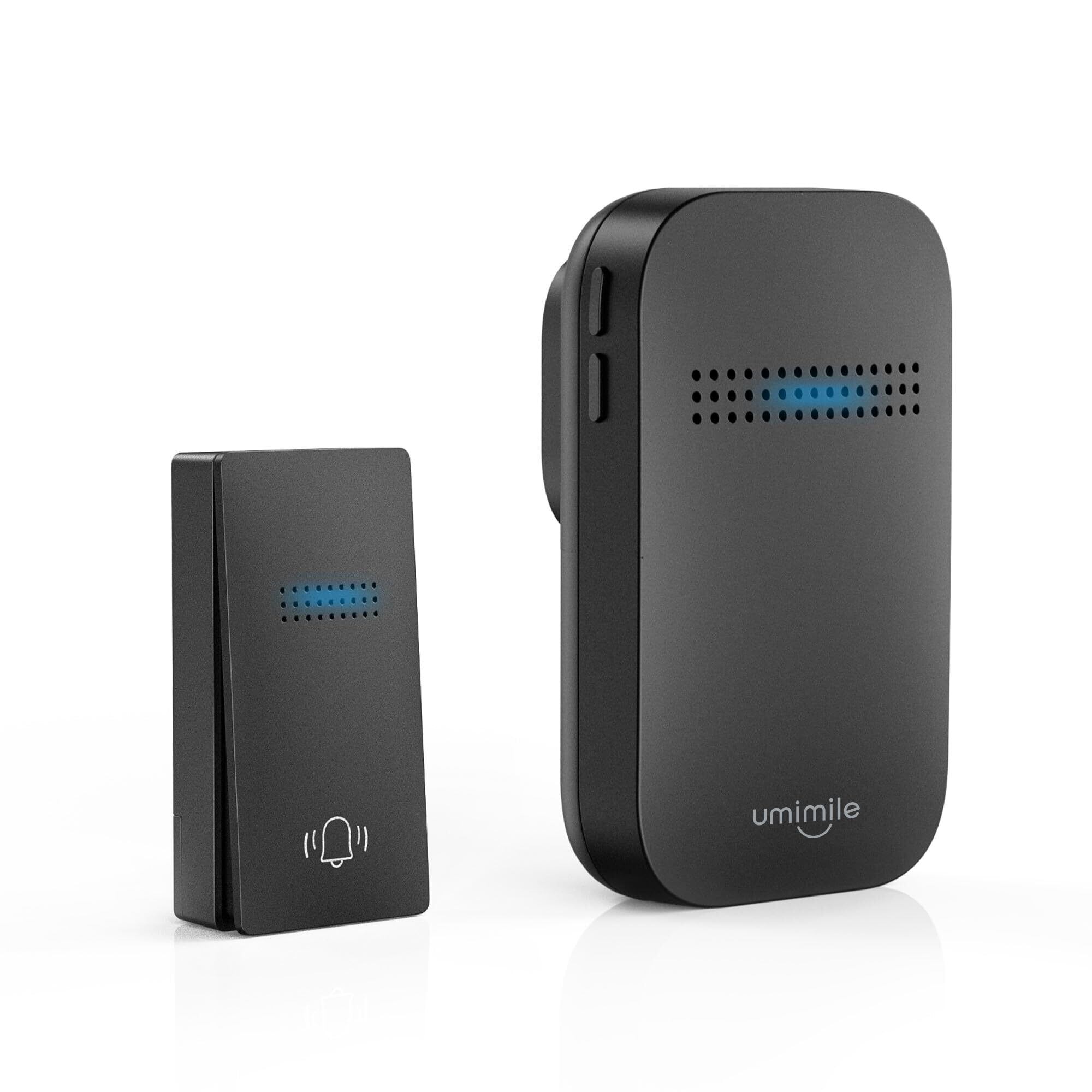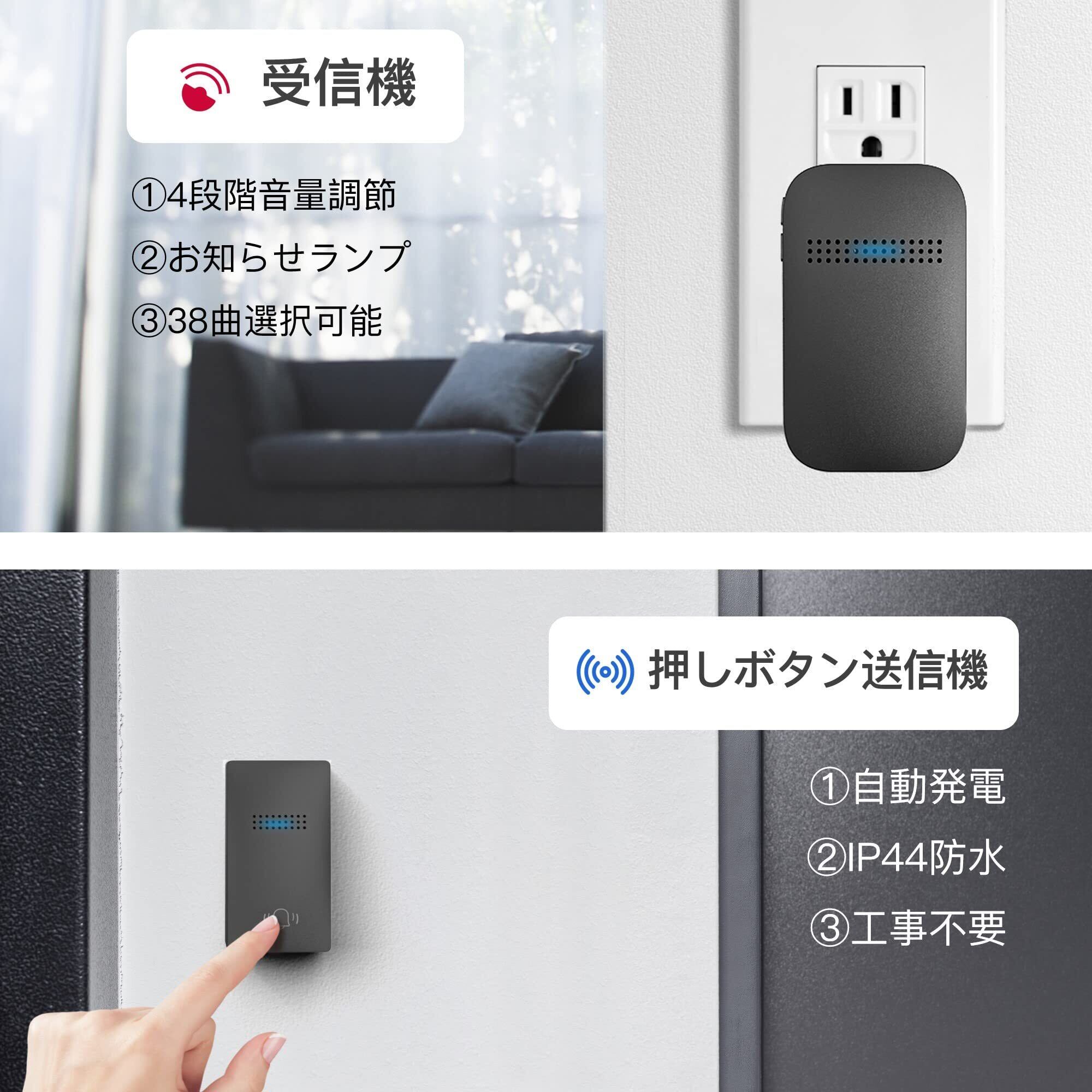 【特価商品】Umimile ワイヤレスチャイム 自動発電 玄関チャイム 電池不要 防水防塵 工事不要 38曲 4段階音量調節 100db 光でお知らせ メモリー機能 ドアベル 介護/飲食店/玄関 150M範囲 二階も聞こえる 来客対応(1T1,ブラック)