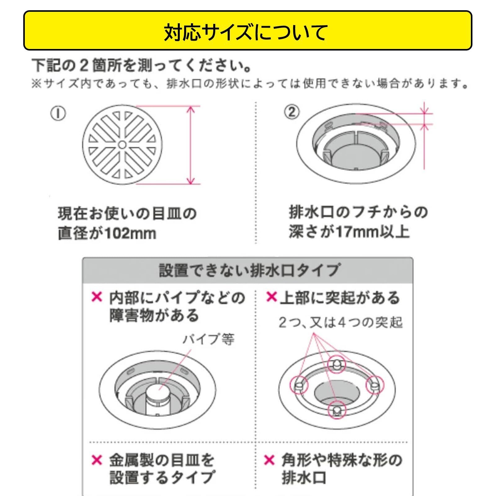 【誰でもできる4ステップ取付け】①目皿を外す②結び目を内側にしてネットを被せる③目皿を元に戻す④汚れが溜まったら交換。シンプルな手順で誰でも簡単に使用できます。