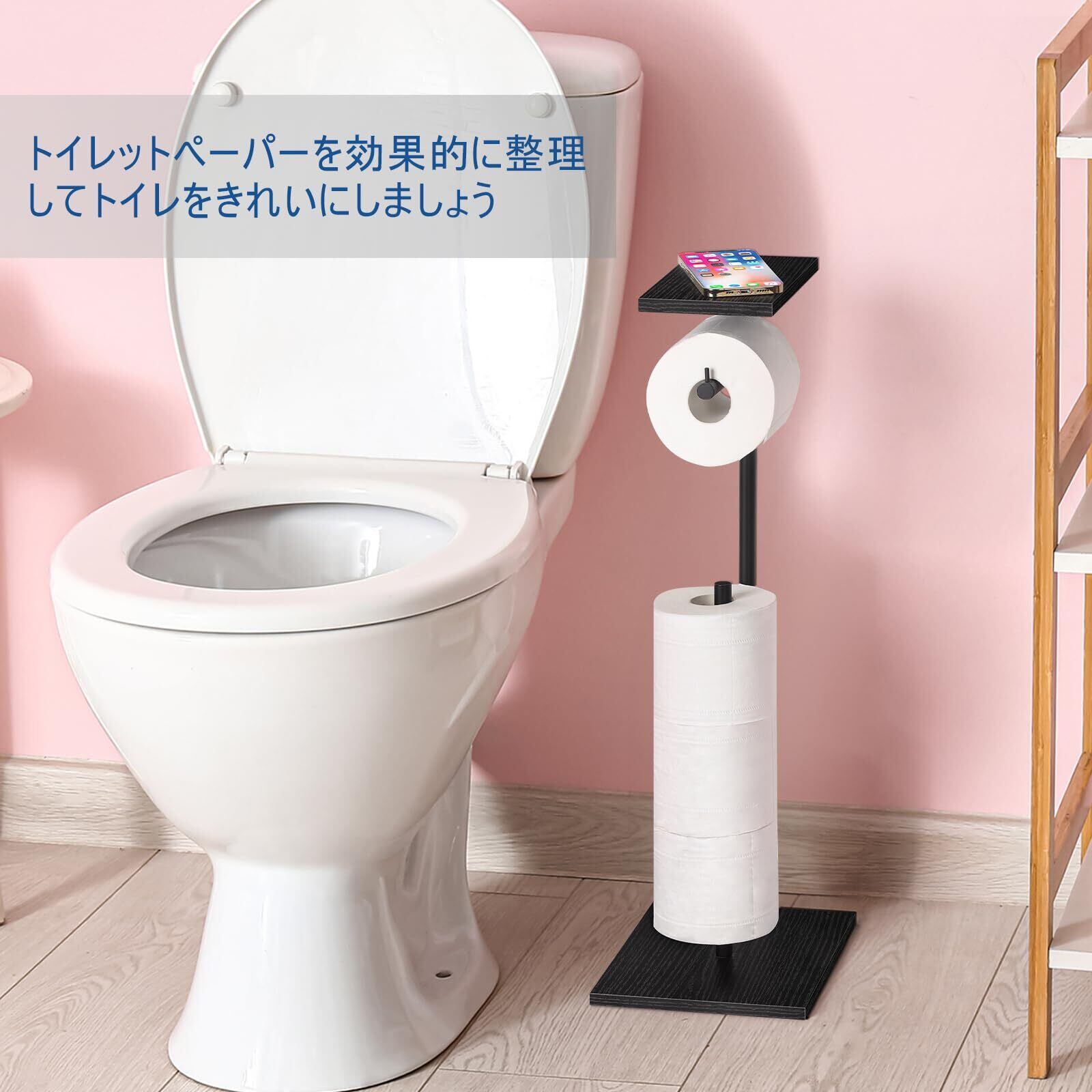 自立式トイレットペーパーホルダートイレットペーパーホルダー 置き型トイレットペーパースタンド ティッシュホルダー ペーパーホルダー ペーパーホルダースタンド 金属ホルダー 木製棚付き キッチンペーパーホルダー トイレ 収納 ラック ブラック