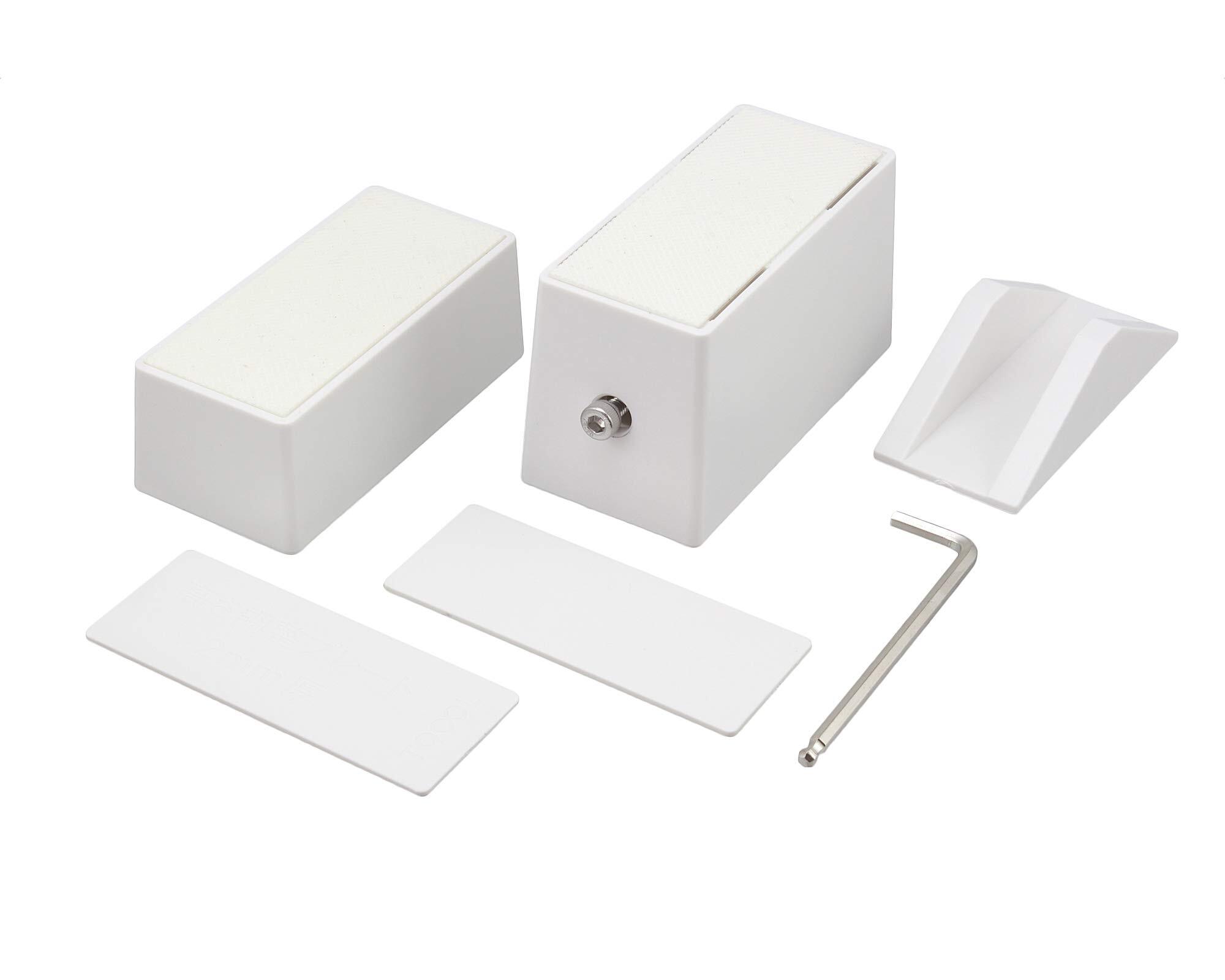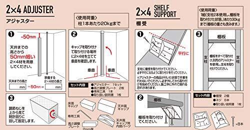 内容物:アジャスター×1セット(床面キャップ×1個、天井面キャップ×1個、天井面キャップ用内部パーツ×1個)/2mm厚高さ調整プレート(2枚)/専用工具(1本)/取り扱い説明書(1枚)