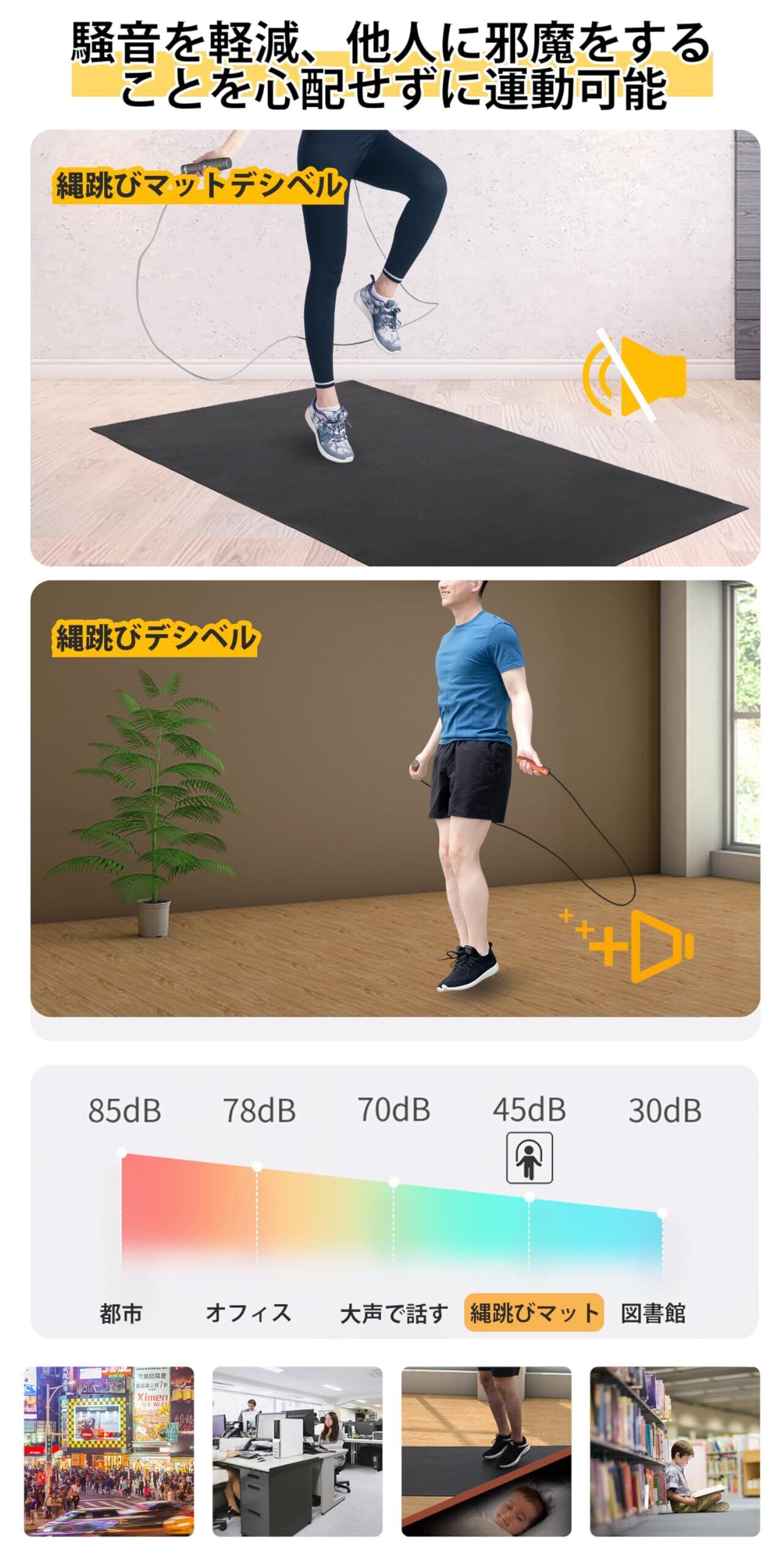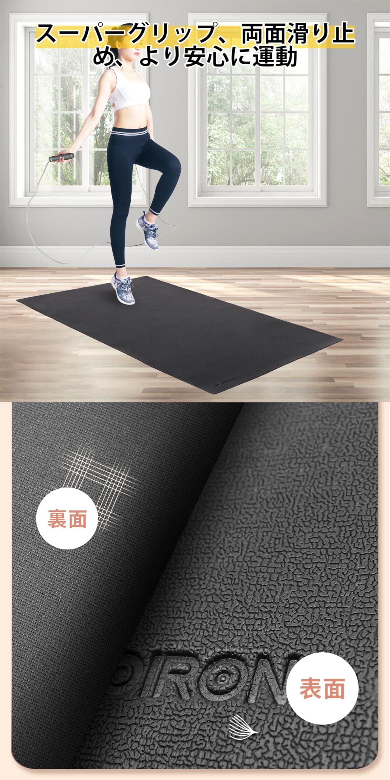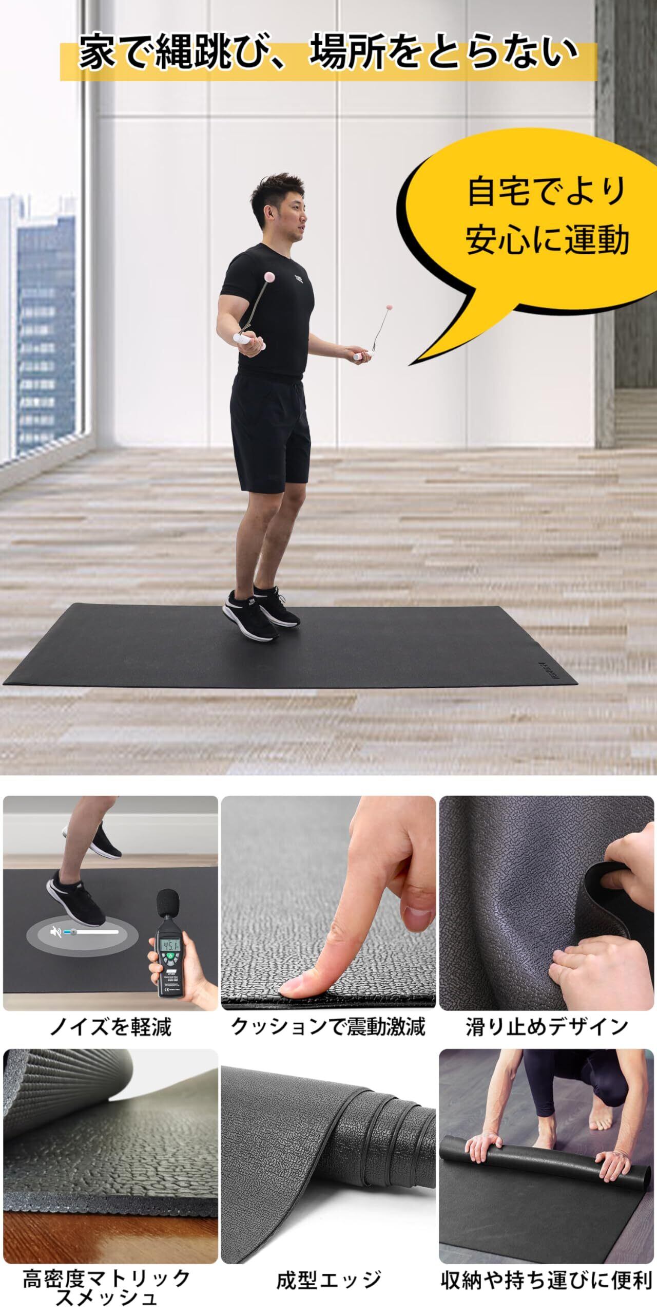 騒音吸収と床保護: この縄跳びマットは高品質の素材を採用し、効果的に騒音を吸収します。また、床から傷や汚れを防ぐ機能もあります。安心して使用できます。