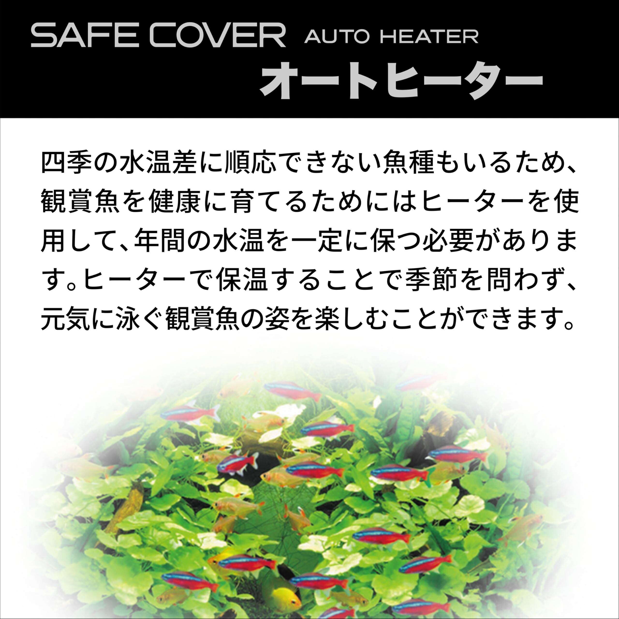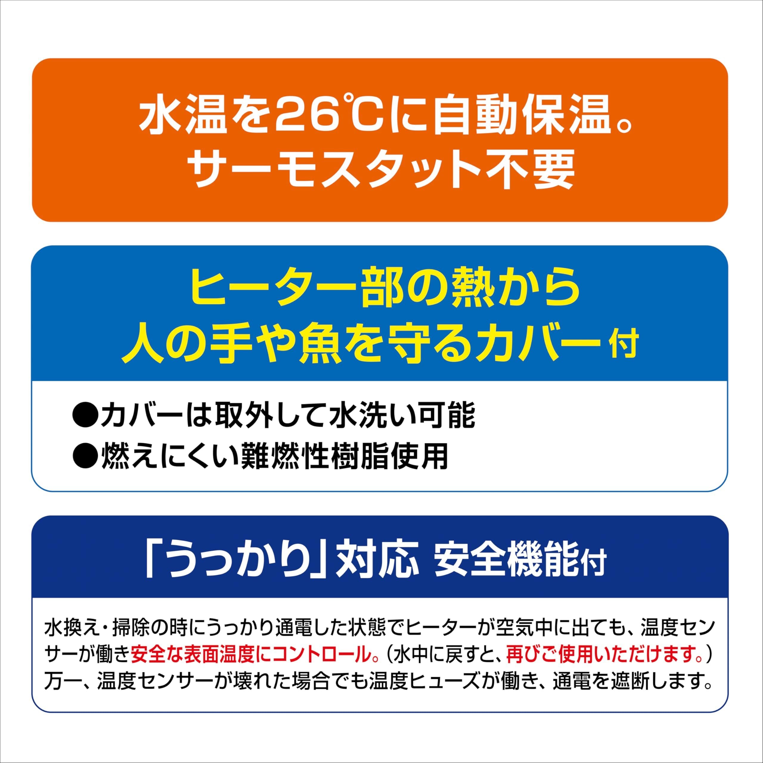 安全を追求した独自の【シャトル構造】を採用。 発熱部と温度制御部を2つの管に分離配置して安定した縦置き使用を実現します。(横設置もOK)。 更に空焚き検知温度センサーを搭載、空気中での通電を感知するとヒーターカバー表面温度を安全な温度にコントロールします。 温度ヒューズを作動させる前に通電を遮断するので、再使用が可能です。 難燃性樹脂を使用したヒーターカバーがついているので、人にも、魚にも安全です。 熱帯魚飼育に最適な26℃に水温を固定します。