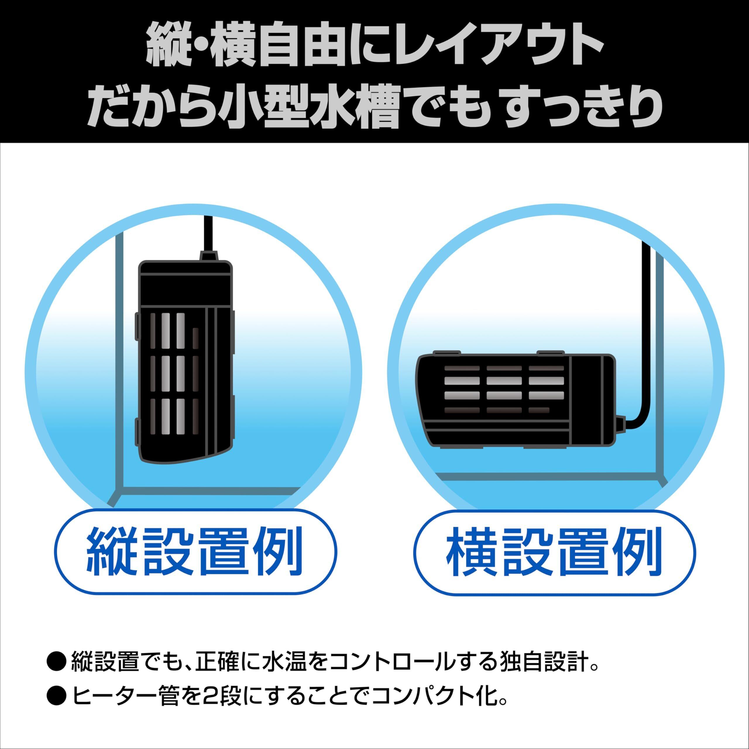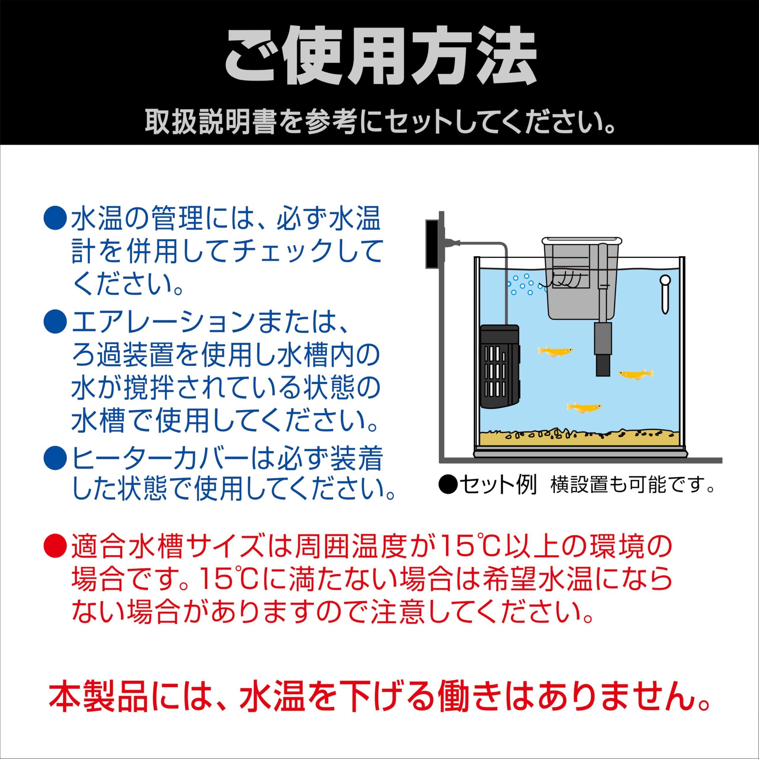 水温の管理には、必ず水温計を併用してチェックしてください ・本製品には、水温を下げる働きはありません ・エアレーション又は、ろ過装置を使用し水槽内の水が撹拌されている状態の水槽で使用してください ・適用水槽サイズは周囲温度が15℃以上の環境の場合です。15℃に満たない場合は希望水温にならない場合があります
