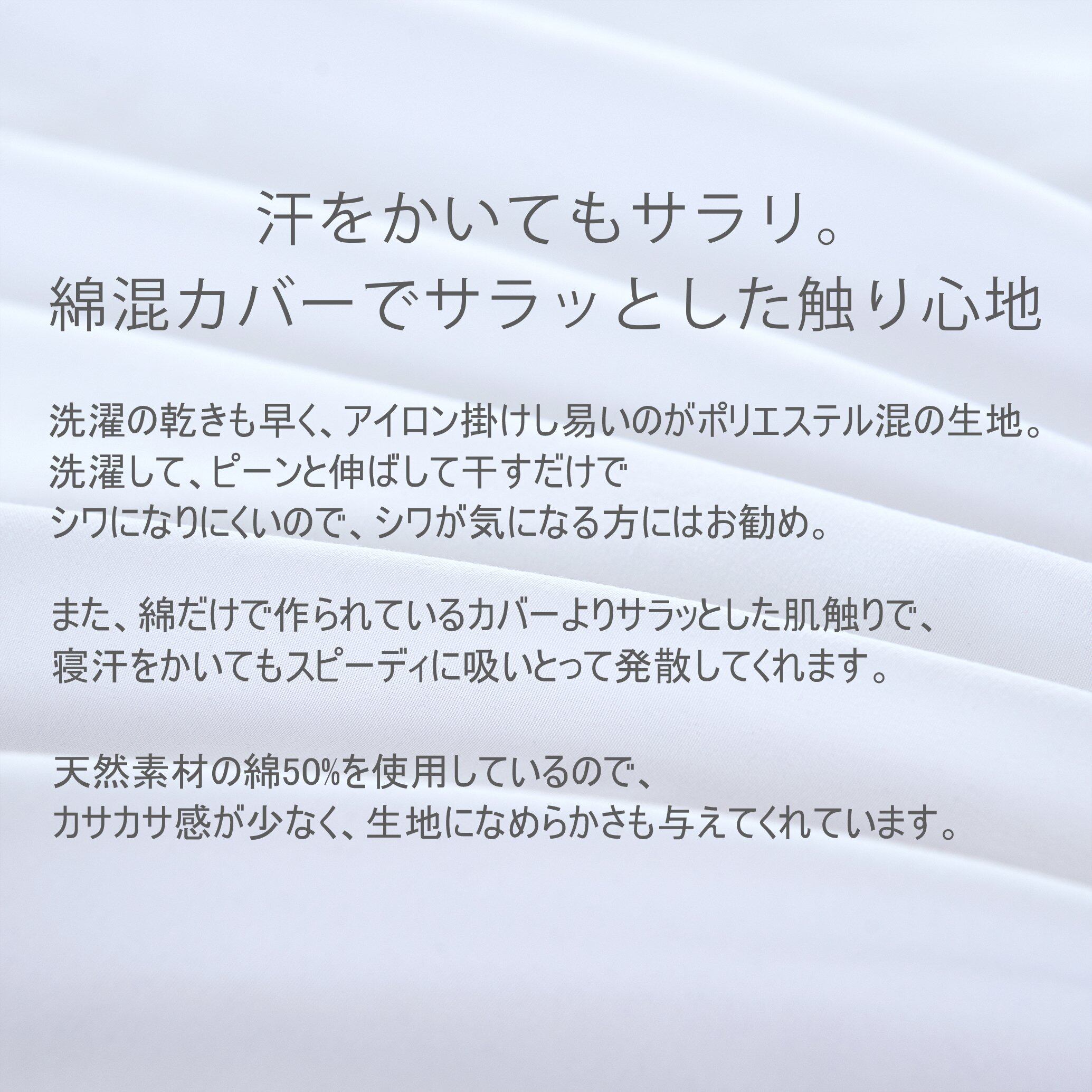 【綿混生地・快適】: 綿50%とポリエステル50%の混紡系なので、速乾性に優れ、乾きが早いからお洗濯も楽々!お洗濯の後シワが付きにくいから手入れも簡単!だからいつでもカバーは清潔に毎日快適に眠れます。きめ細やかな「ピーチスキン加工」なので、すごく柔らかくて肌触りがよいです。無臭無毒で、子供でも楽に使用できます。