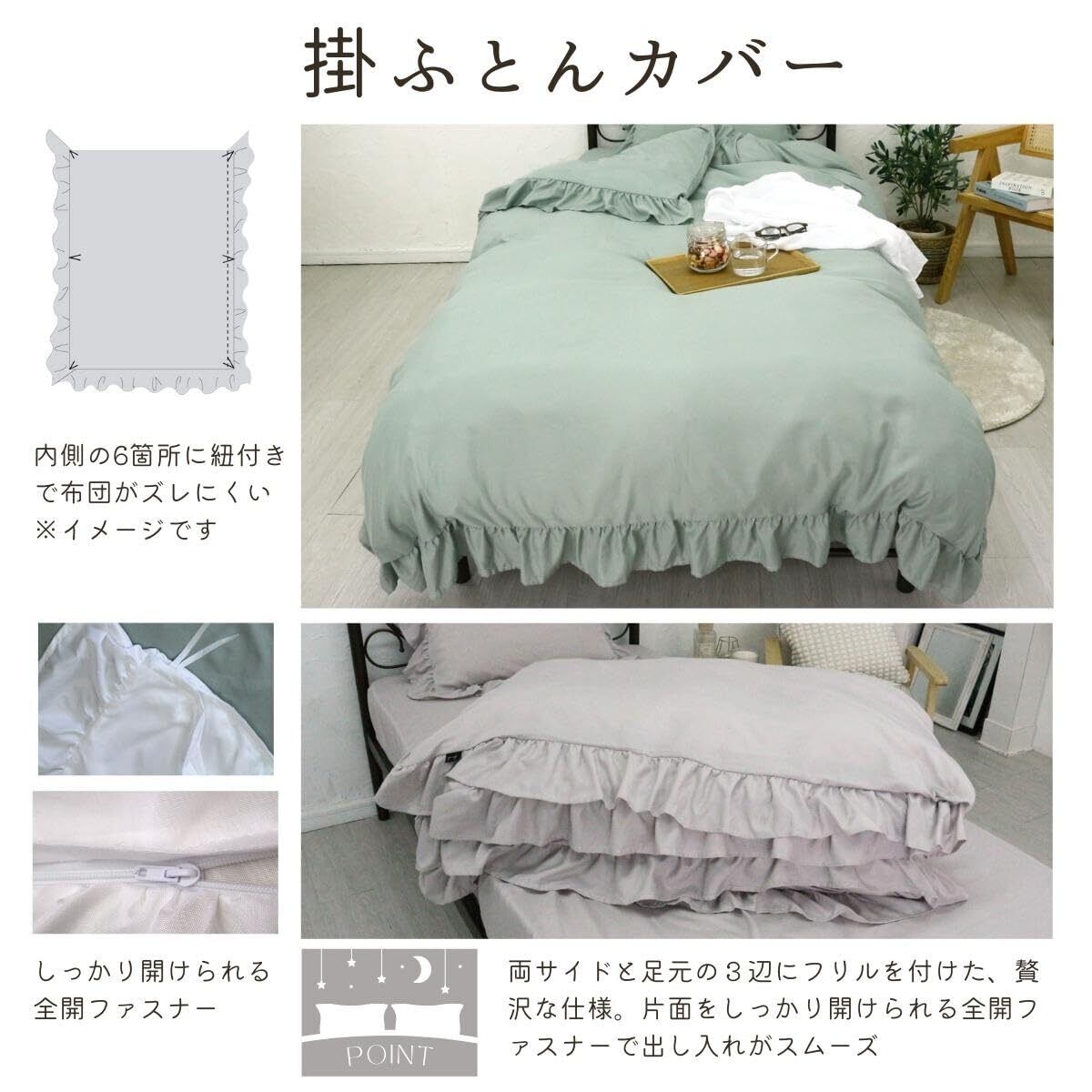 大人可愛いフリル布団カバー。オールシーズン使えて、どんなインテリアにも合わせやすいアイテム。フェミニンなフリルデザインですが、選べる6色のくすみカラーよりあなたのお部屋を、可愛いプリンセス系や、大人可愛い系などに演出。ベット周りから、お部屋の雰囲気を変えてみませんか。 枕カバー、掛布団カバー、ボックスシーツが、各1枚ずつの3点セットなので、統一感が生まれ、お気に入りのお部屋にコーディネート出来ます。 しっとりやわらかな肌触りのピーチスキン加工。洗濯機OKなので、じゃぶじゃぶ洗えて乾きやすい素材。シワになりにくい生地なので、お手入れも気軽で簡単!ご自宅用はもちろん、大切な方へのギフトとしても最適!
