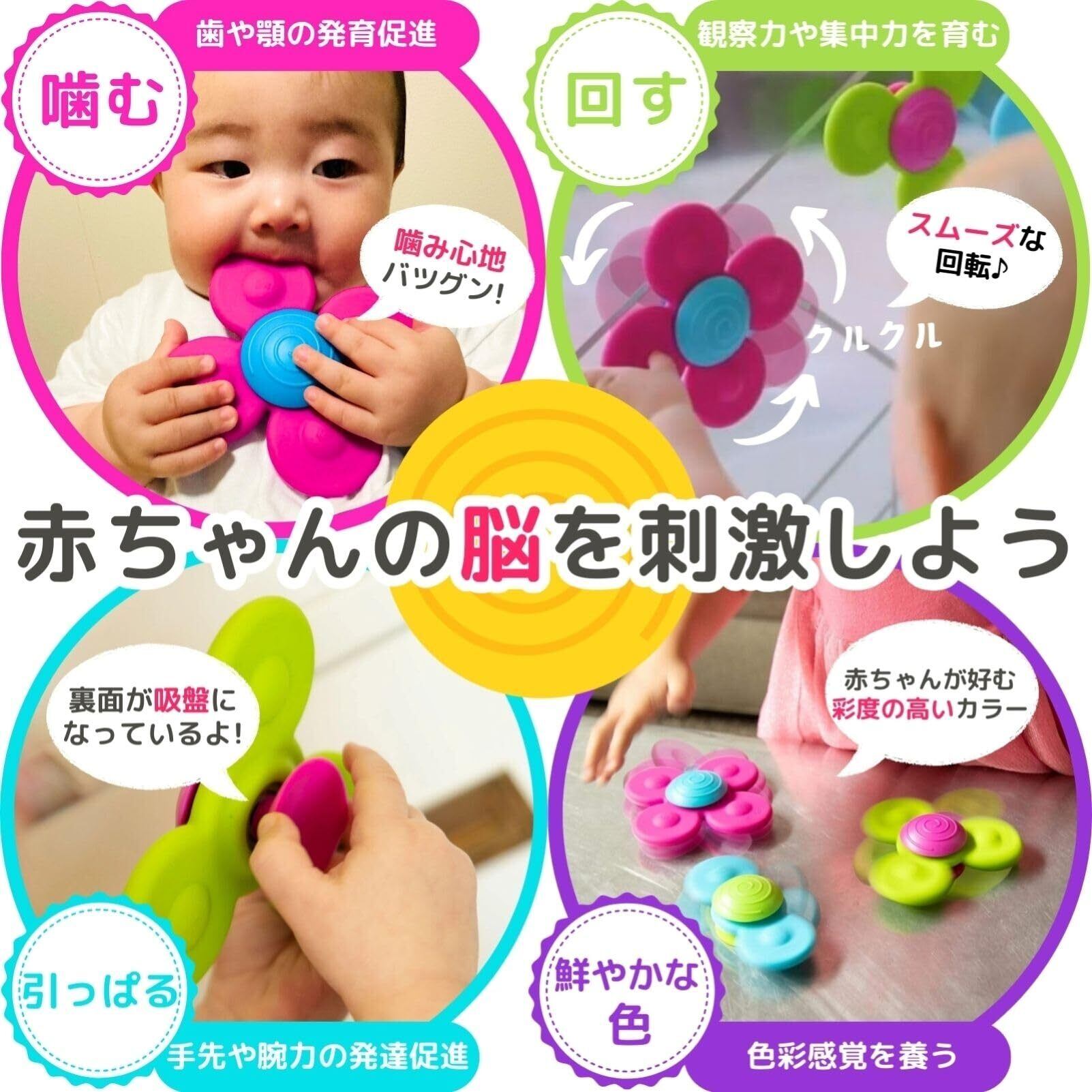 裏面には吸盤が付いていて、テーブルや窓にくっつけてスピンさせて遊ばせたり、歯がためとしてもお使いいただけます。