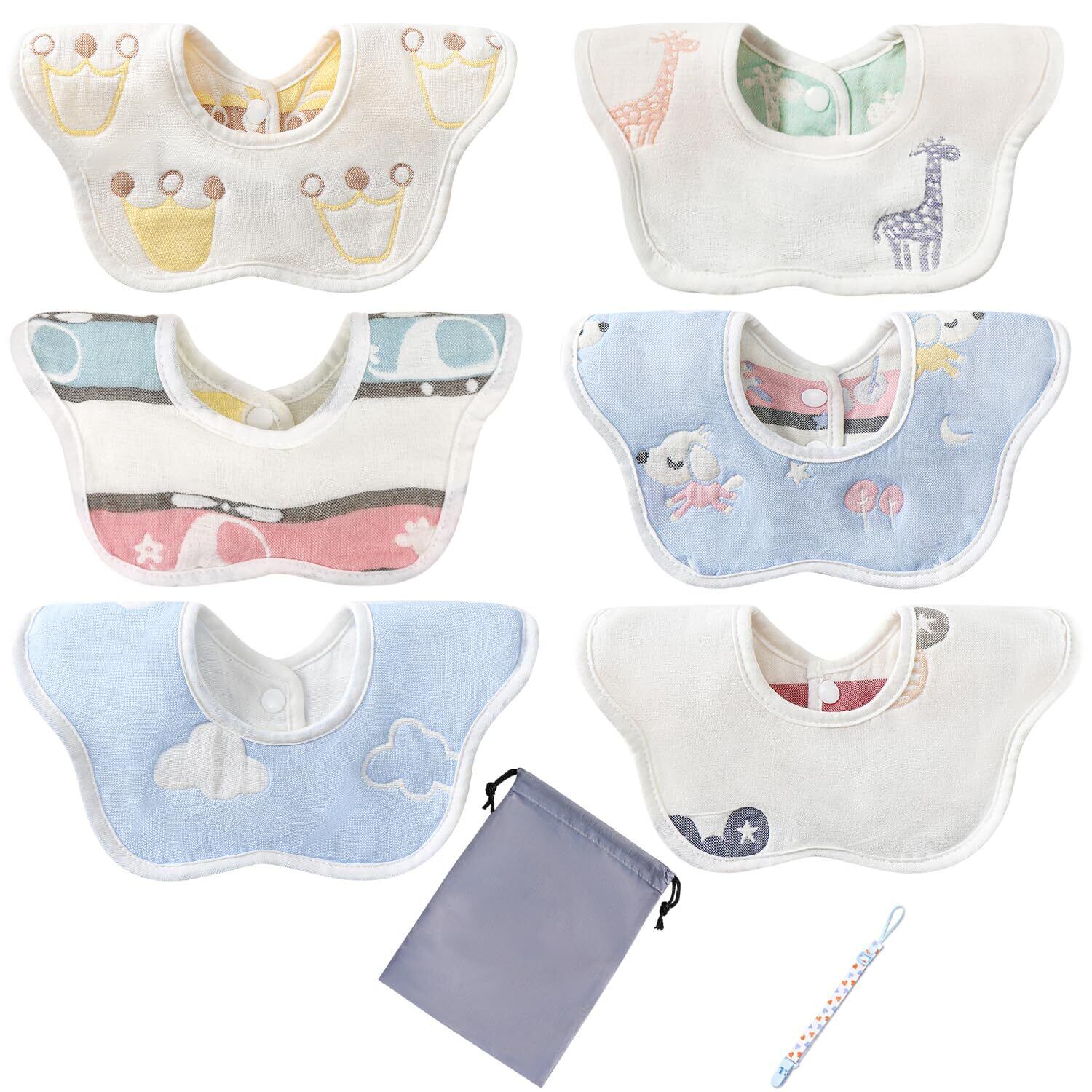 [Comfort U] よだれかけ スタイ ベビー ビブ 男の子 6枚セット 綿100% 6重ガーゼ 吸水 柔らかい 花びら型 360度スタイ 赤ちゃん エプロン スナップボタン 食事用 収納袋付き 出産のお祝い ギフト