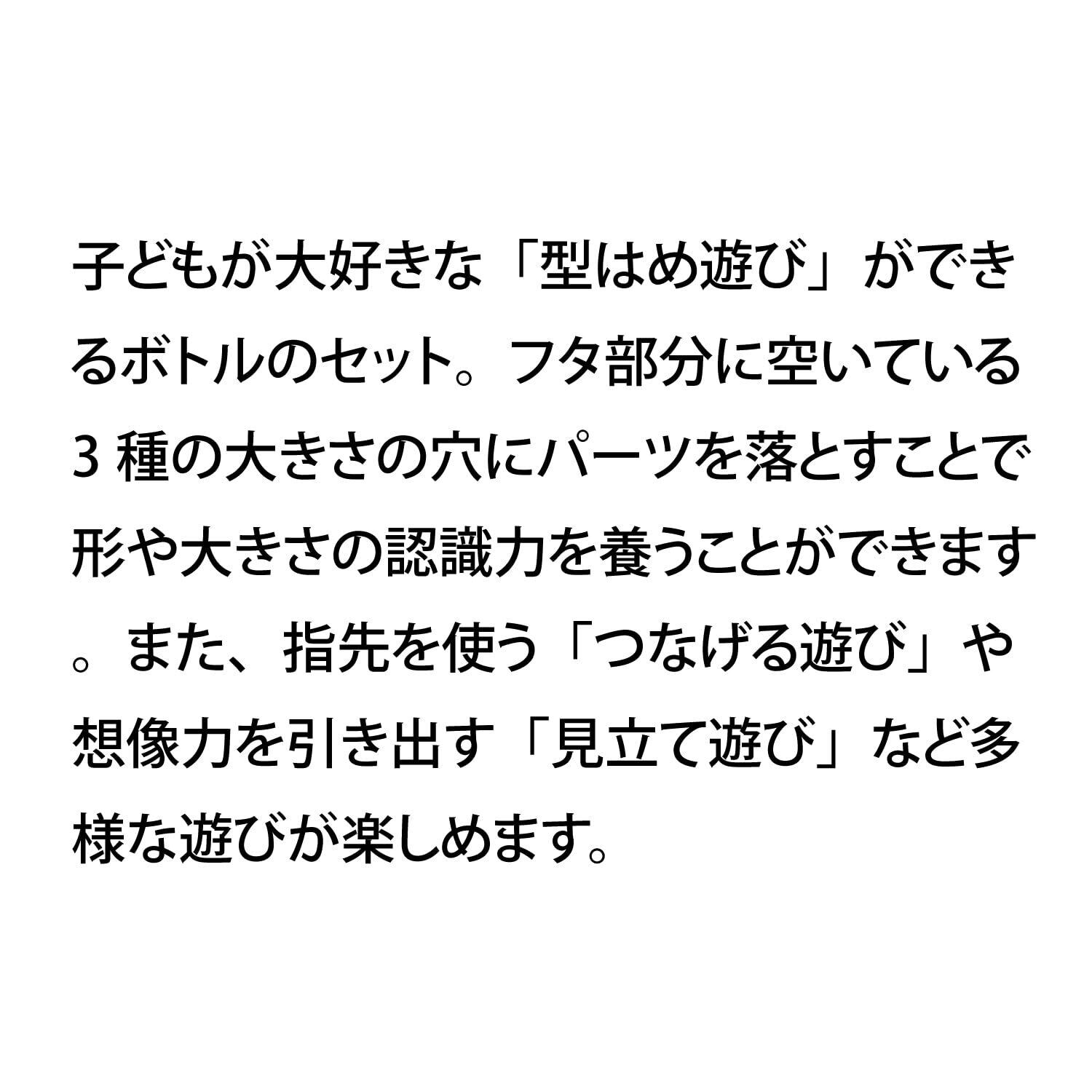 遊び方無限のニューブロックは、お子さまの「創造性」を刺激し、豊かな「経験」をつくります。 ニューブロックの特長 ・やわらかくて大きいから安心・・・やわらかいから踏んでも投げても痛くない、大きいから誤飲の心配のない安心設計。 ・創造力を育む特徴的な形・・・「つなぐ」「はさむ」「さしこむ」など様々な組み方ができ、創造力や認知力を育みます。 ・成長に合わせて長く遊べる・・・見立て遊びやごっこ遊び、大きな作品づくりまで1.5歳から小学生になっても遊べます。 「Gakkenニューブロック はじめようボトル」は、型はめ遊びができるボトルのセット。ふたの部分に空いている3種の大きさの穴にパーツを落とすことで形や大きさの認識力を養うことができます。また、指先を使う、つなげる遊びや想像力を引き出す見立て遊びなど多様な遊びが楽しめます。