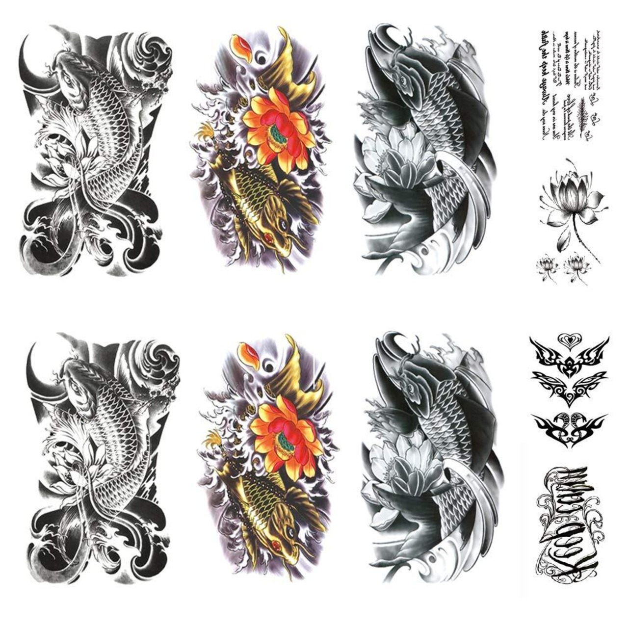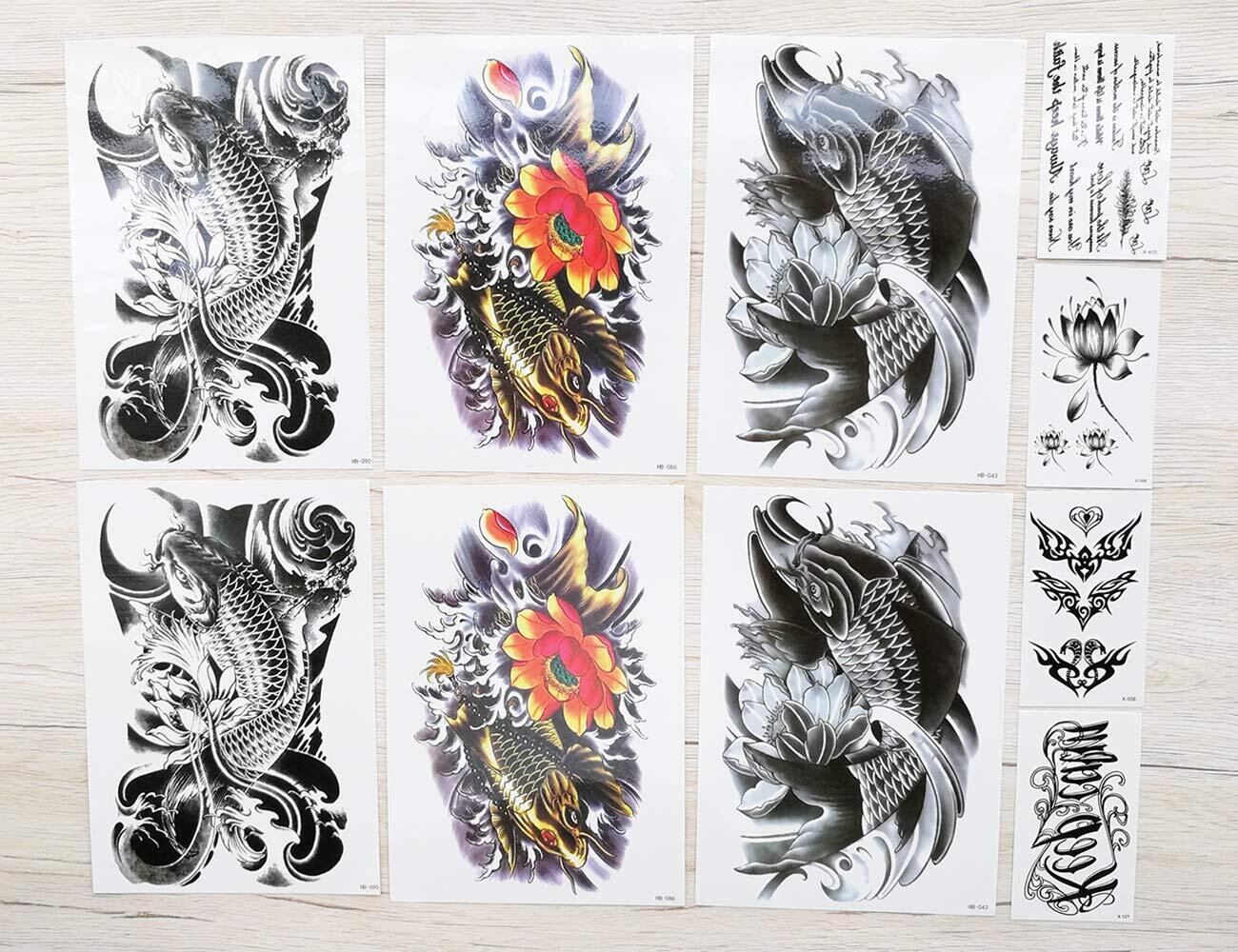 【セット内容】タトゥーシール 鯉 蓮の花、10枚セット。大判 鯉 タトゥー 6枚 (3種類X2)、小柄 タトゥー 4枚 (4種類X1) 。