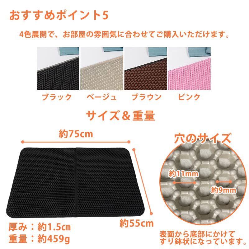 【二重構造】 猫砂マットは二重構造で、猫の足に付いた砂が落ちるとすぐマットの間に挟まって、 マットの内部に集まった砂を再利用することができます、室内をきれいに保ちます。 ペットの足裏に付いた砂などもハチの巣構造でマットの中に集めてくれます。 猫砂の飛散を防ぎます、猫のトイレの周りを清潔に保ち、清掃時間を節約します。 折り畳みできるので収納する場合スペースを節約できます。