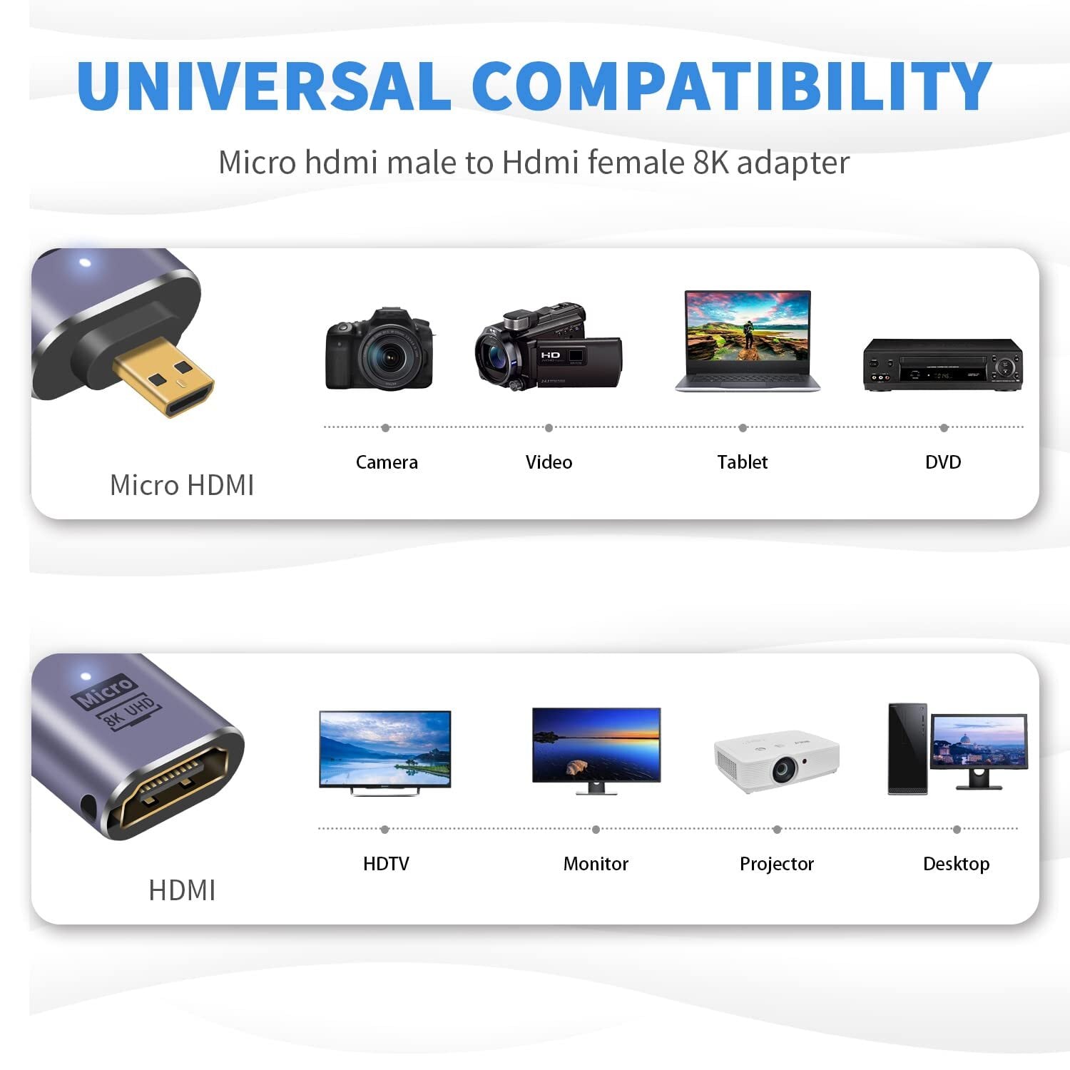 8k micro hdmi to hdmi 変換アダプター、8K@60Hz、4K@144Hz、2K@240Hz、1080P@240Hzのフル8k解像度をサポートします。Micro HDMI to HDMIコネクタ,アルミケースと金メッキコネクタで安定した信号伝送を確保。