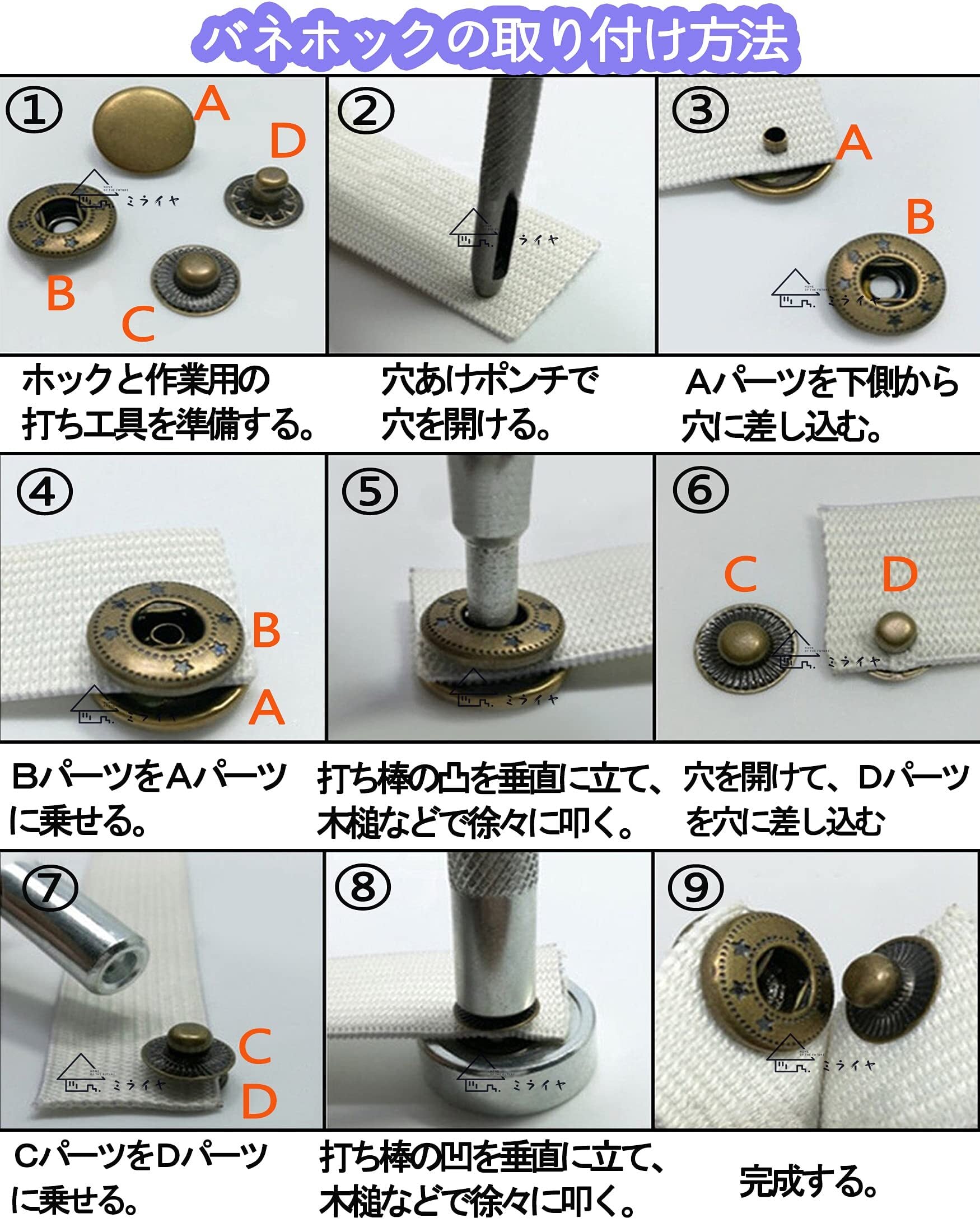 【セット内容:】:【ホック合計60組】:①バネホック10mm×12組 ②バネホック12mm×12組 ③バネホック15mm×12組 ④ジャンパーホック17mm×12組 ⑤ジーンズボタン17mm×12組。【打ち具合計9点】:655#10mm用*2本 。633#12mm用*2本。831#15mm用*2本。201#17mm用*1本 。ハトメ抜き : 2.5mm*1本。打ち台*1個(こちらの商品には説明書は付いております。ご了承のほどお願い申し上げます。)