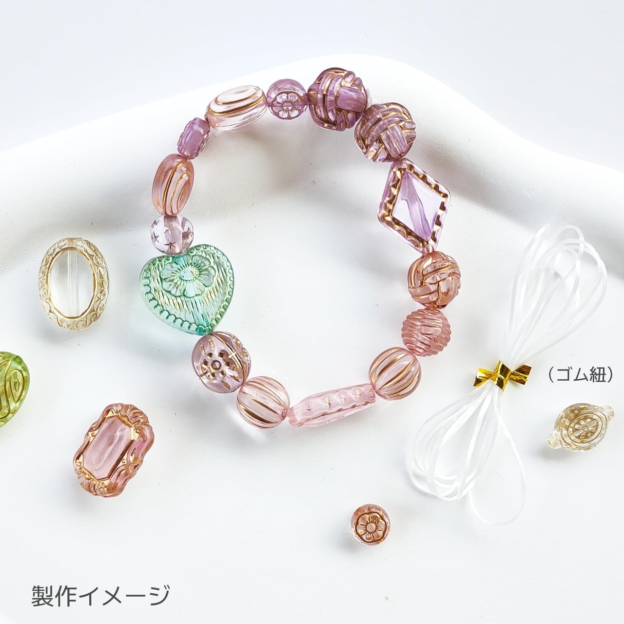 ・ブレスレット用ゴム紐がついているので、試しに自分だけのブレスレットを作ってみては!パーツの組み合わせ方で雰囲気の違う作品に仕上がりますのでとっても楽しいです!
