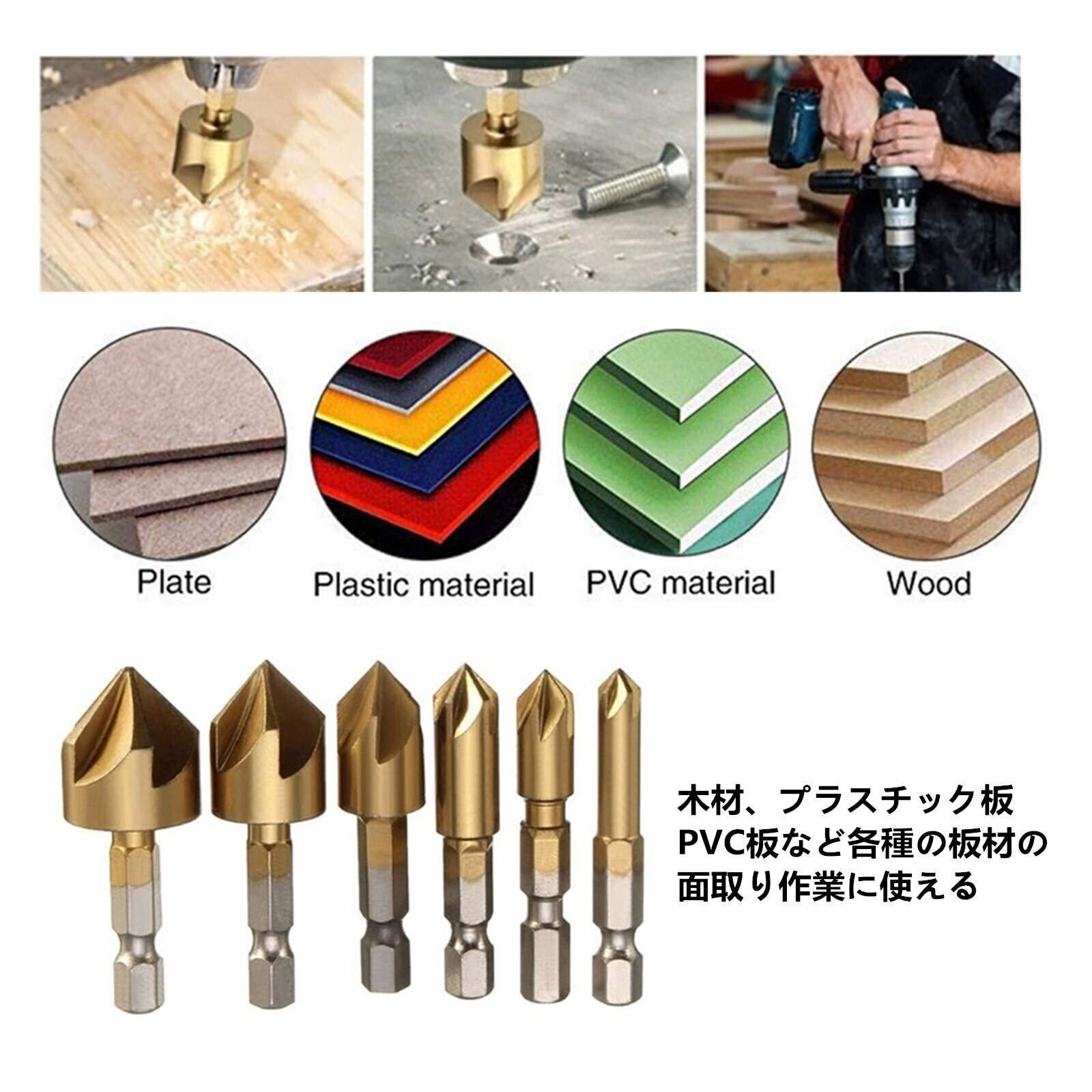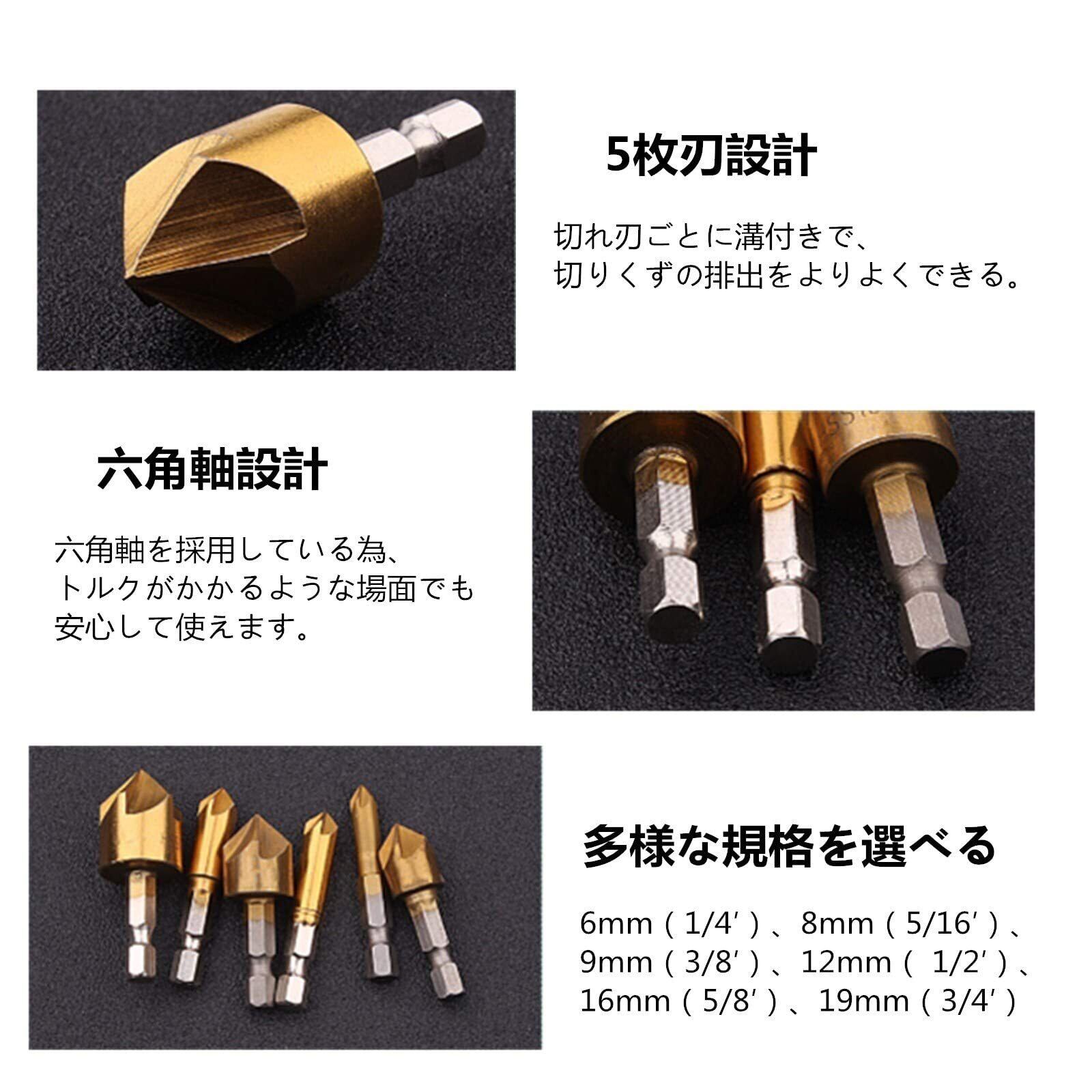 皿取り錐ドリル ビット 7本セット 6/8/9/12/16/19mm+1本自動センターポンチ 皿取錐 下穴錐 座ぐり 面取りカッター バリ取り セット 六角軸 5枚刃 チタンコーティング ドリルビット