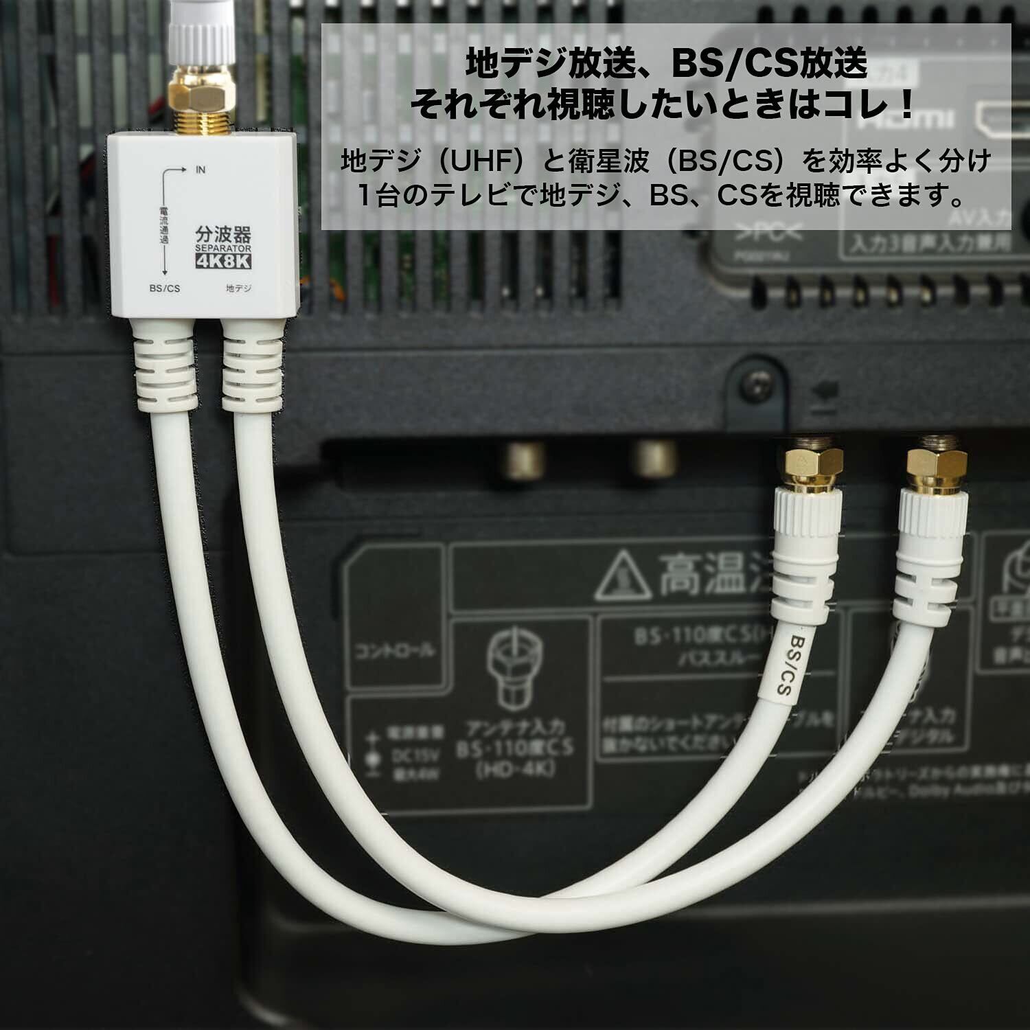 ■地デジ放送、BS/CS放送をそれぞれ視聴したいときはコレ! 地上波(UHF)と衛星波(BS/110度CS)を効率よく分け、1台のテレビで地デジ、BS、110度CS放送を視聴できます。 ■新4K8K衛星放送対応 従来の地デジ、BS、110度CS放送に加えて、最新の4K/8K放送にも対応しています。 ■ケーブル一体型構造 分波器本体と出力側ケーブルが一体型のつくりになっているため、分離型に比べて接続損失を軽減することが可能です。 ■BSアンテナ電源供給可能 【使用上の注意】 ご使用には入力用のアンテナケーブル(別売)が必要です。