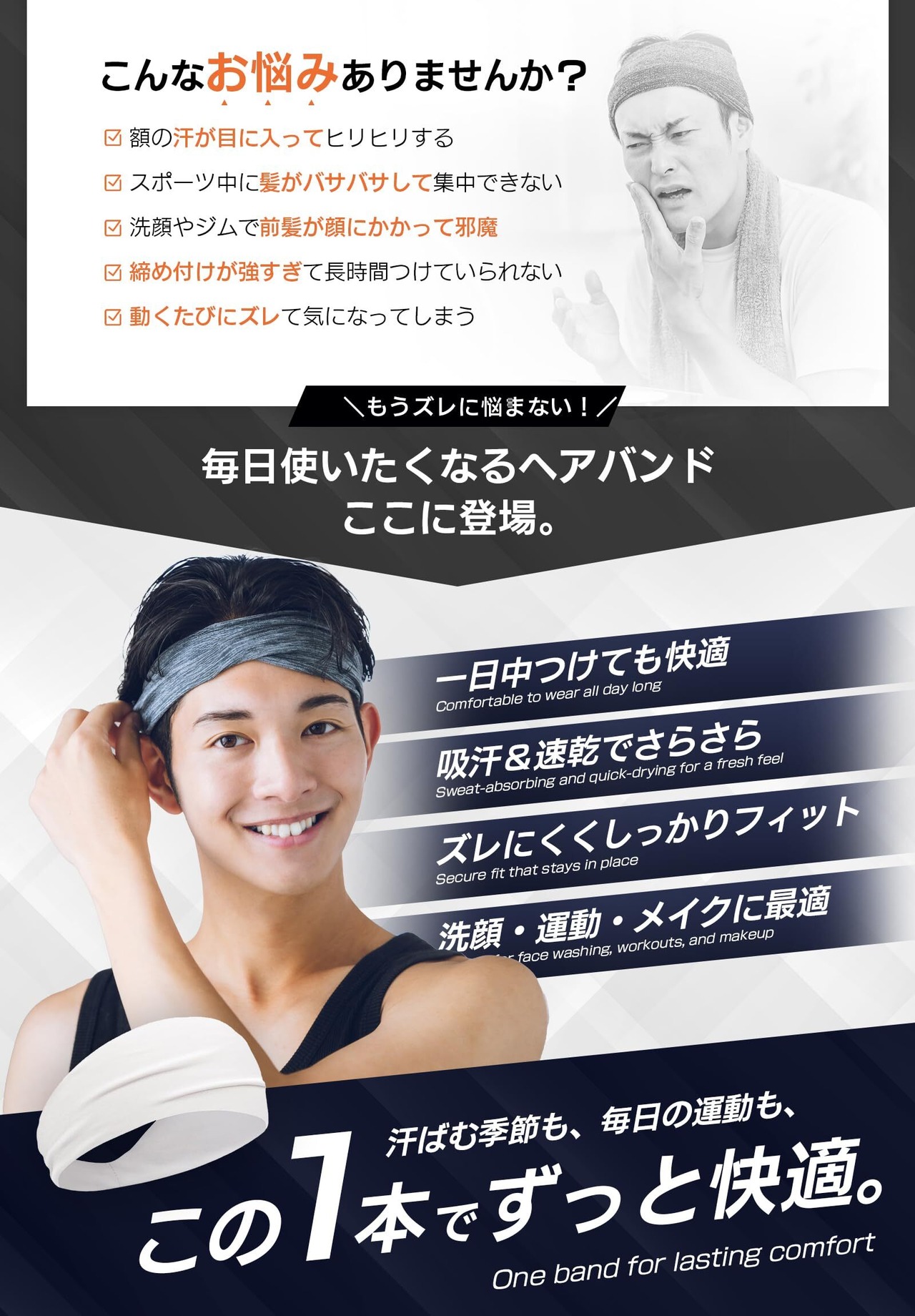 ■【肌触り抜群】 素材は伸縮性が高く、頭囲60以上の方でも強すぎる締め付け感を感じることなく着用していただけます。 サラッとした素材ですので、肌が擦れて痛くなりにくいです。男性だけでなく、女性も使用できるヘッドバンド。