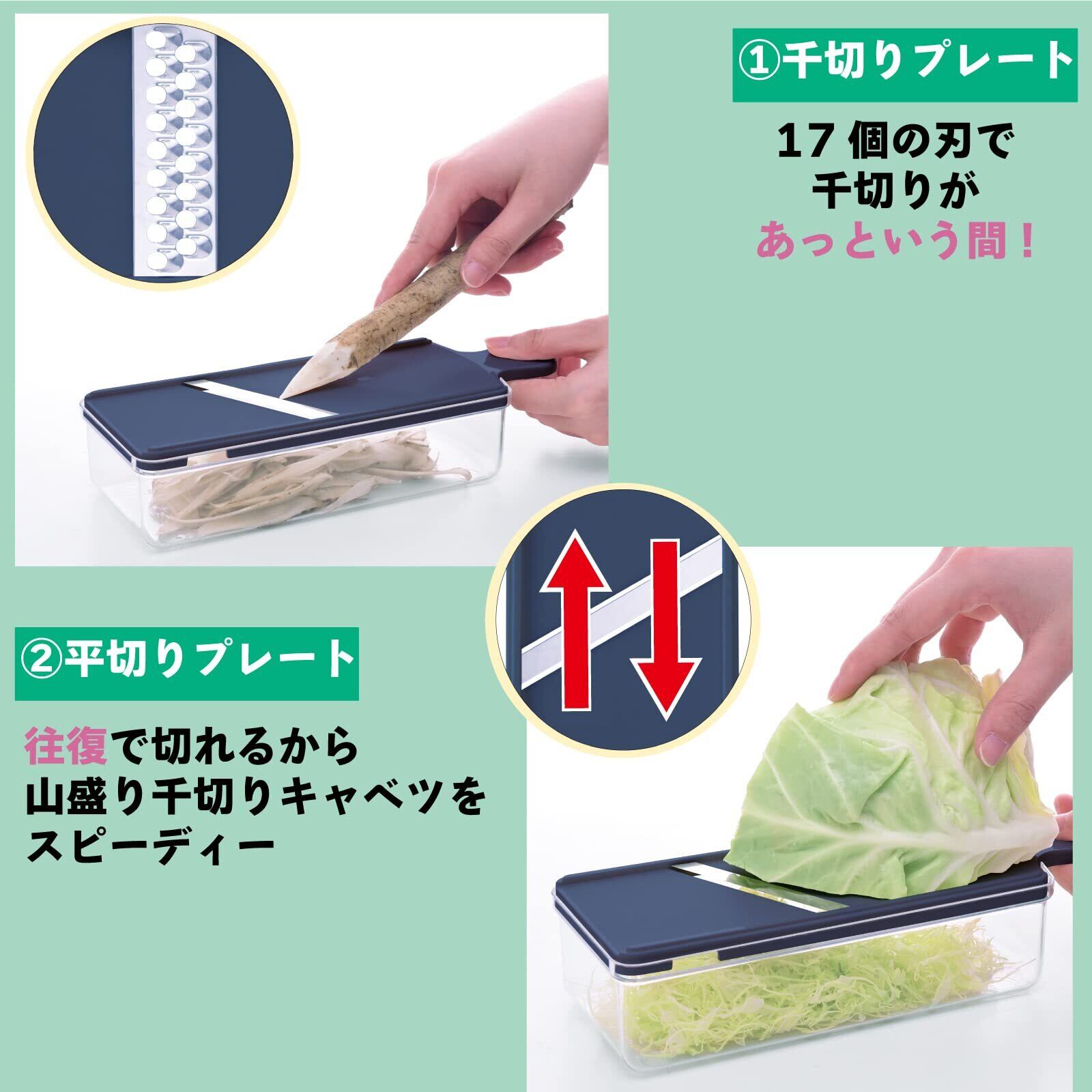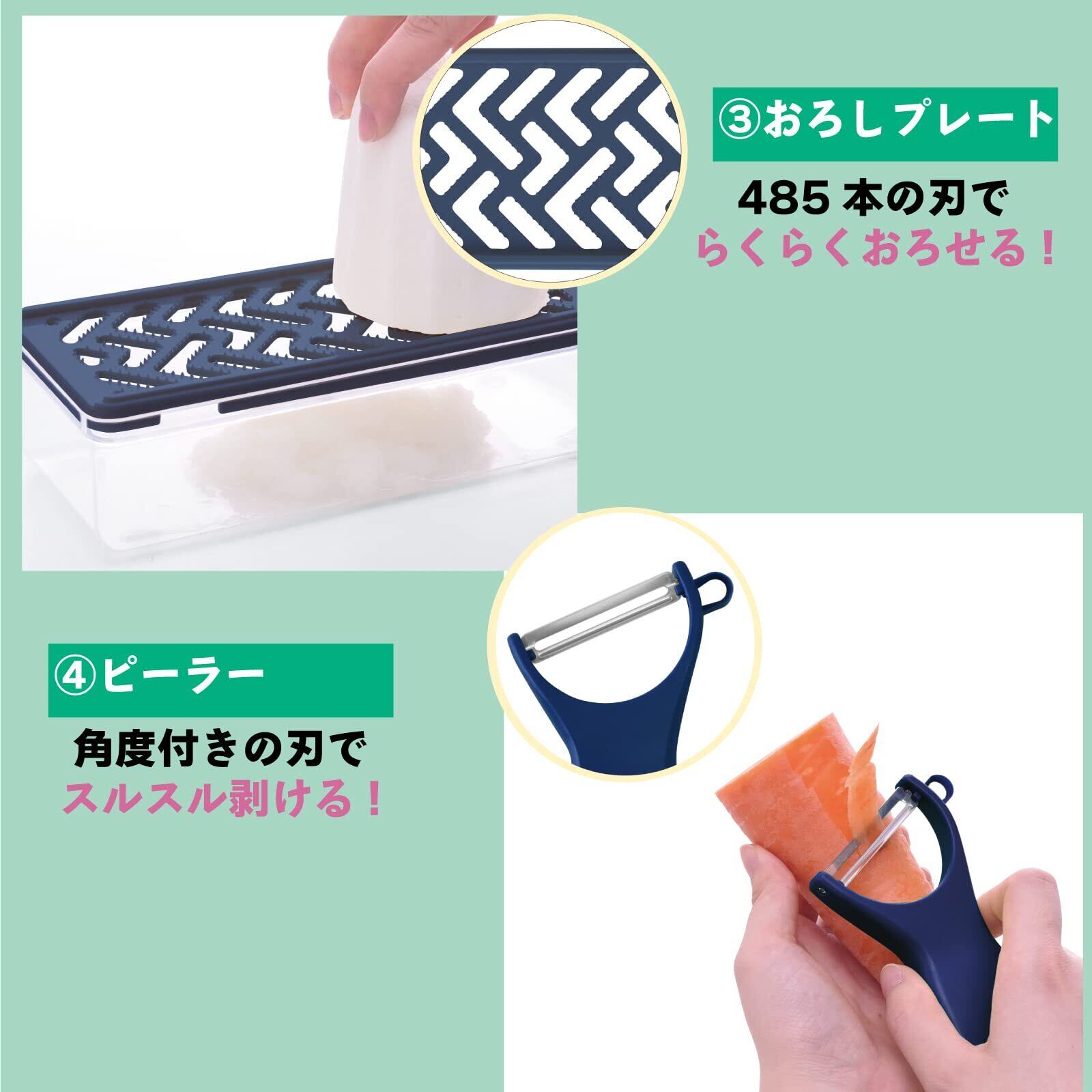 【7点すべてがいい仕事をしてくれます】千切りプレートで面倒な千切りもあっという間! 平切りプレートは往復で切れるので、山盛り千切りキャベツもスピーディー! おろしプレートは485本の刃で大根や山芋がラクラクおろせる! ピーラーの刃は角度付きなので皮が剥きやすい! ケースとカバー付きなので、引き出しにコンパクトに収納できる! 安全ホルダー付きで小さい野菜にも安心して使える! ケースには滑り留め付きで安心して使える! プレート先端はフック形状で、ボウルやザルとも組み合わせて使える!