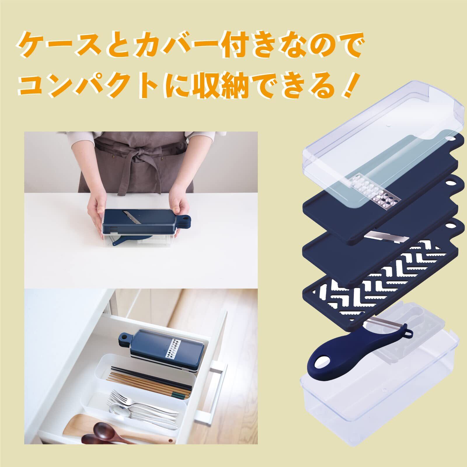 千切り、平切り、おろしのプレート3枚とピーラー、安全ホルダー、ケースとカバーが付いたお買い得7点セット。引出にコンパクトに収まるサイズ感で場所をとりません。